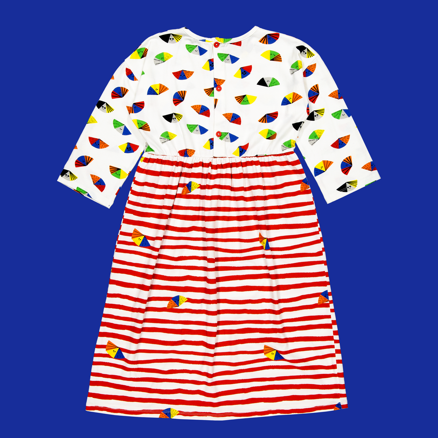 The comfy dress with rounded neckline, buttons on the back, below-the-knee length and three-quarter sleeves.