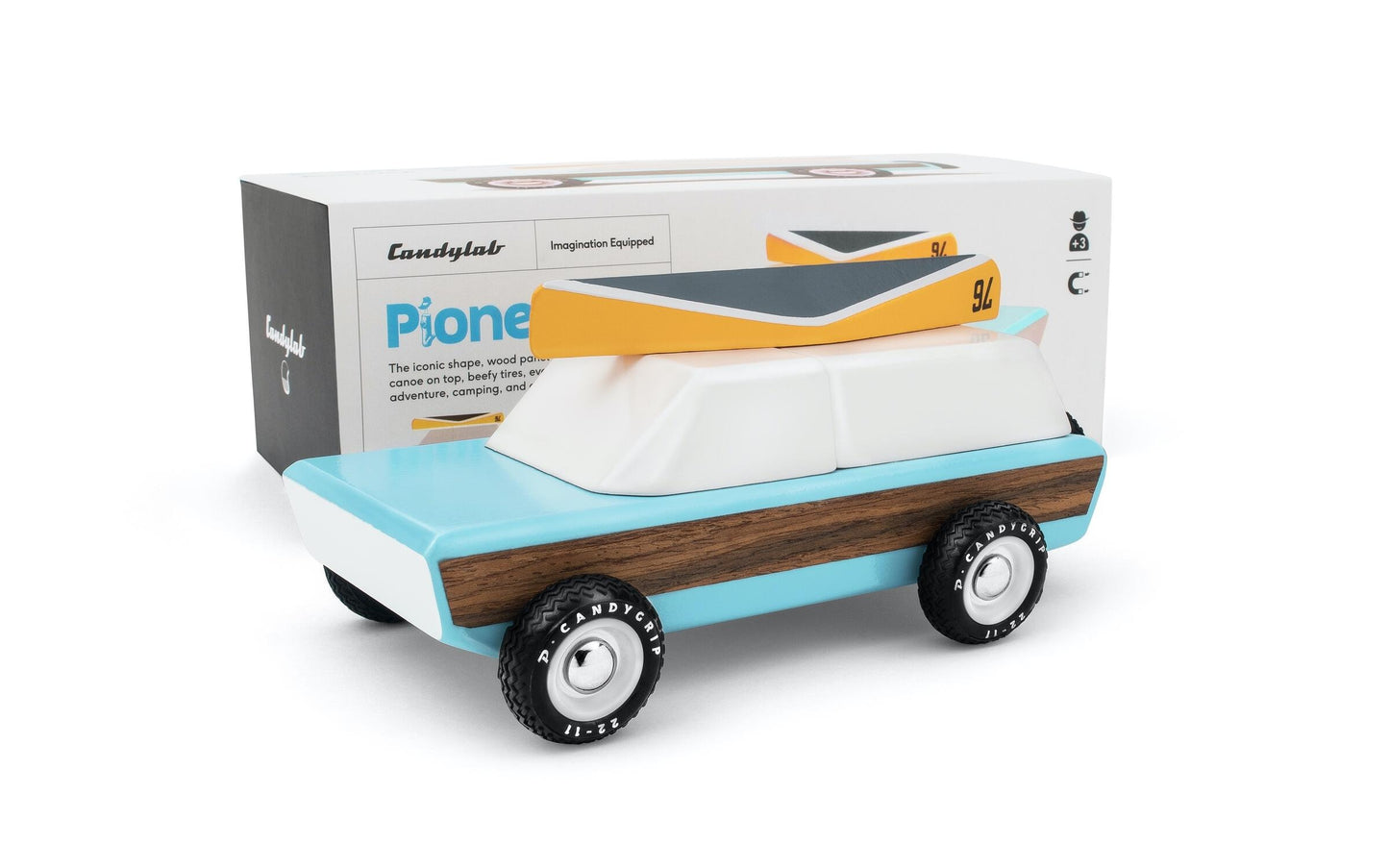 The iconic shape, wood sides, magnetic canoe on top, beefy new tires, everything screams adventure, camping, and good old times. Miniature learning tool on how to adventure properly. Solid Beech wood, water-based paint, and clear urethane coat. White ABS plastic rims, with food-grade rubber tires.