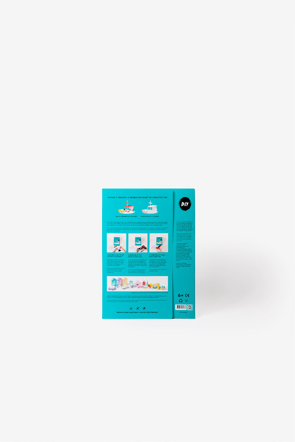 Once colored and built, the models can be kept to play or decorate a room. First comes coloring, it’s time for creativity. Without glue and scissors, all models are pre-cut which makes it impossible for children to fail or hurt themselves. They put the model together, and observe how magical volumes and space are. Finally, children can play, using their own figurines such as Playmobil, and make up never-ending stories in their own paper world.