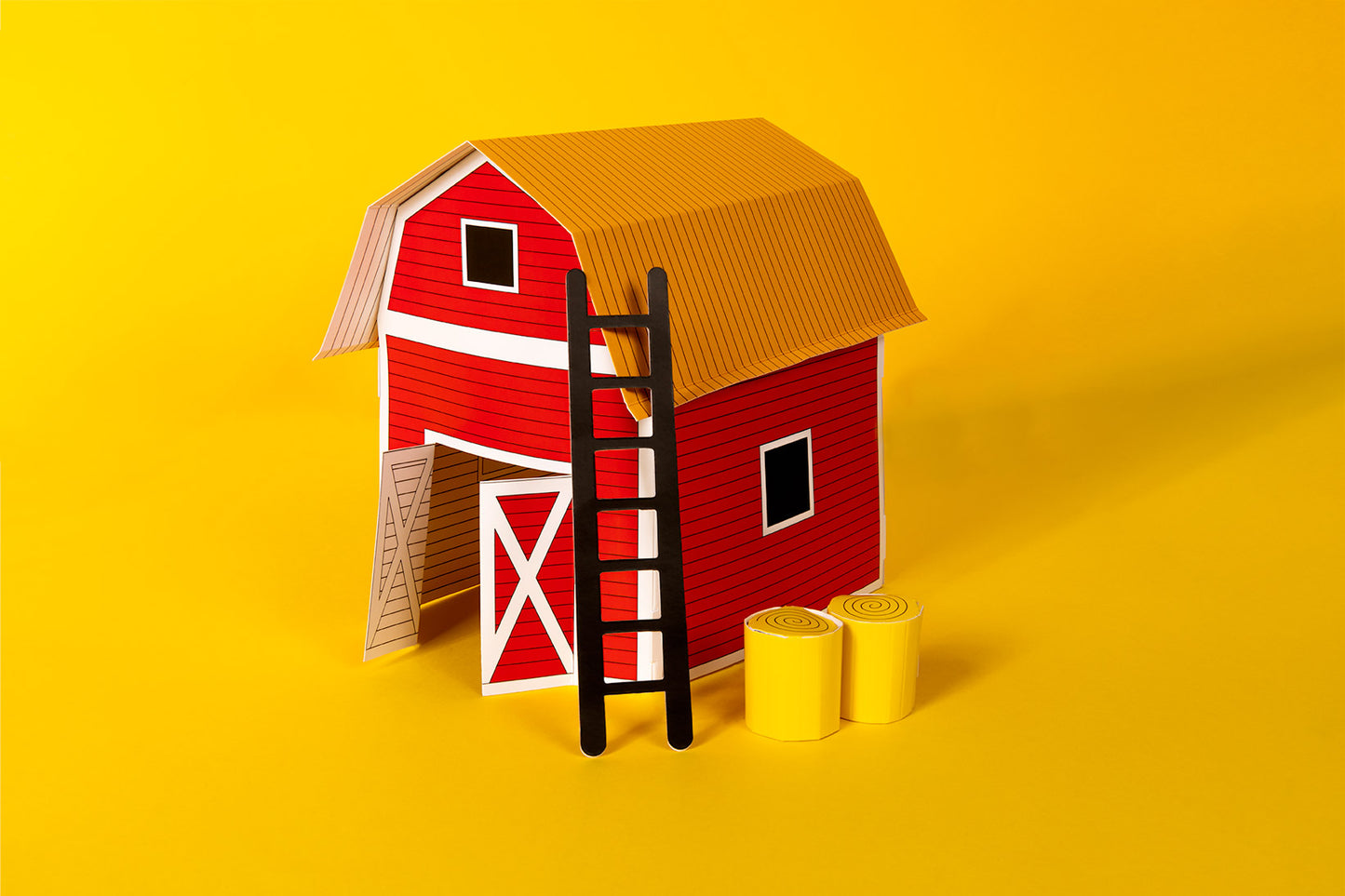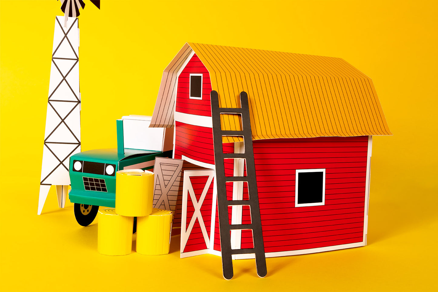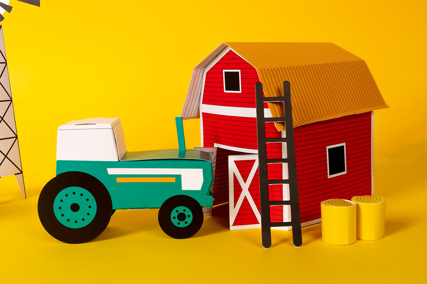 Inside: 1 farm, 1 ladder, 1 windmill, 1 truck, 3 hay bales