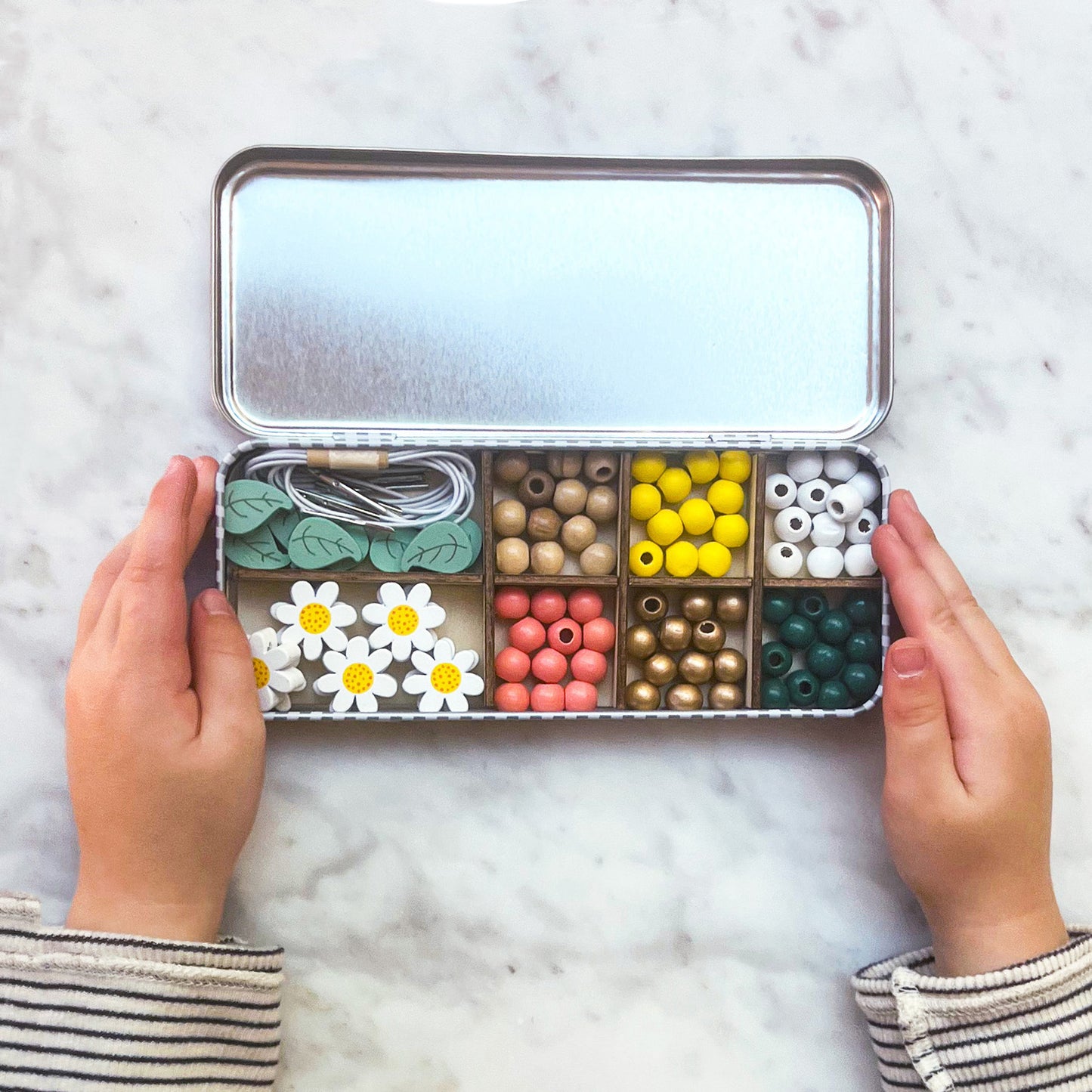 The daisy bracelet beading kit is perfect for three to eight year olds. Containing enough wooden beads to make 5 bracelets, a selection of daisy, leaf & spherical beads await. Children can wear the bracelets with their favourite outfits, gift them to friends they love, or make them with friends at a party!