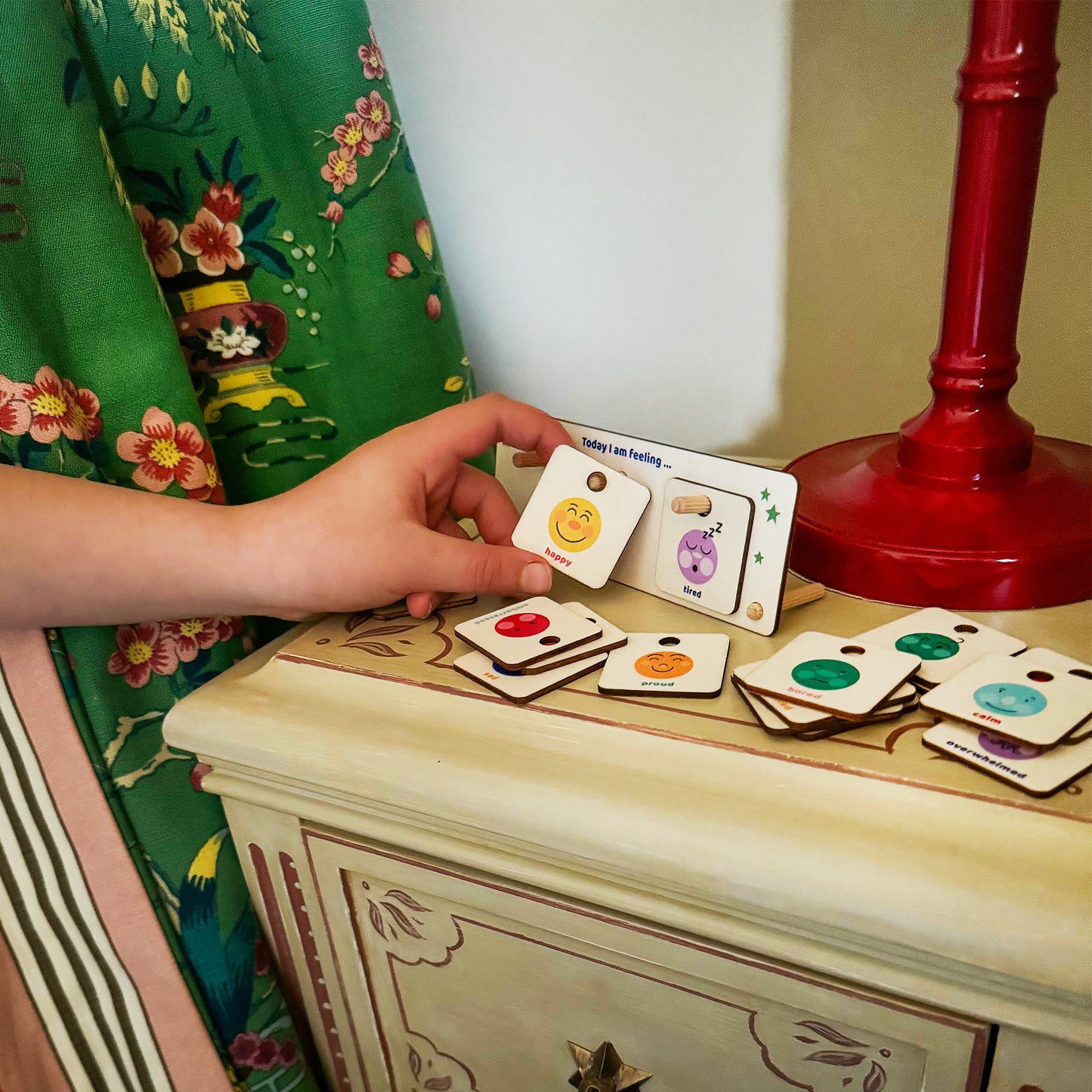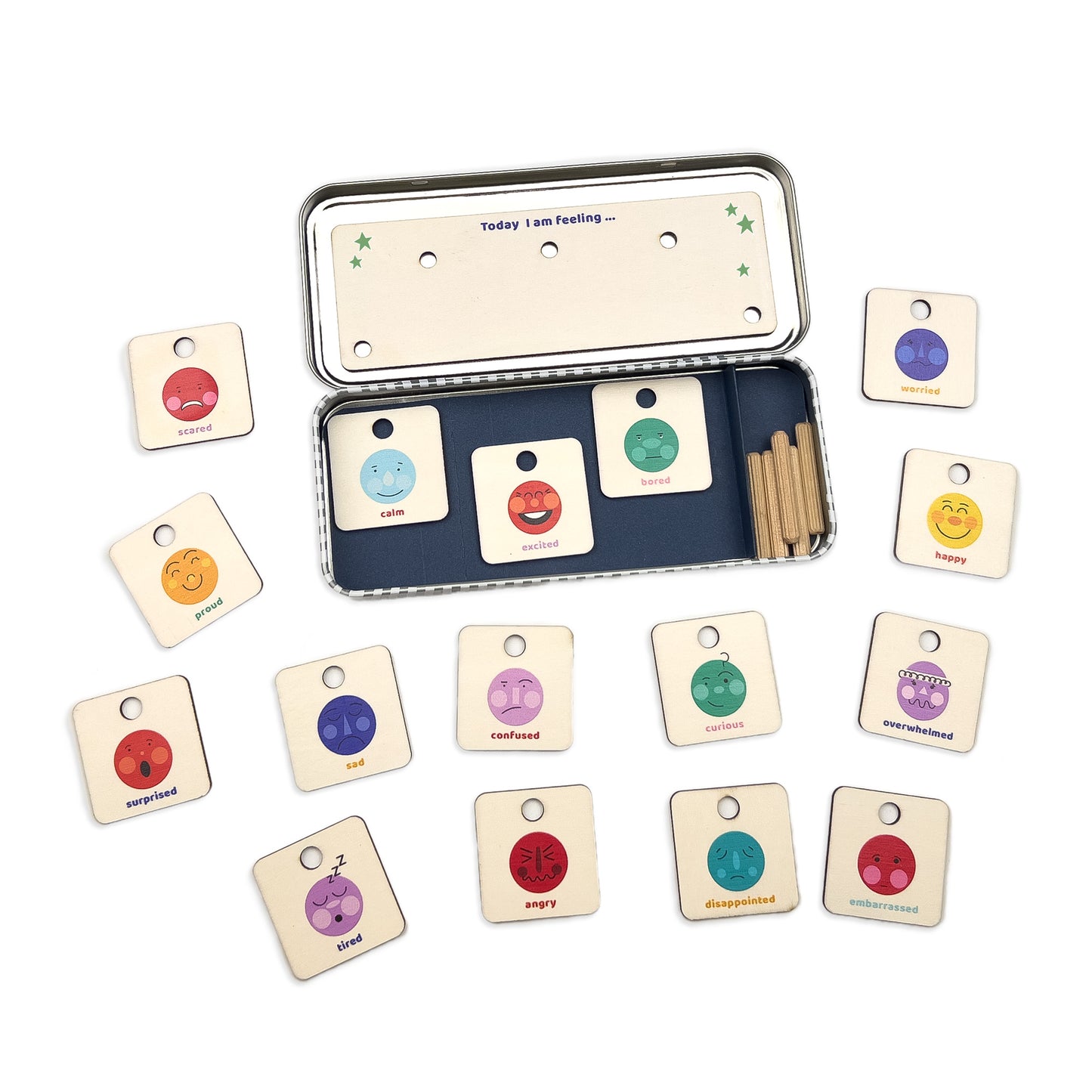 Designed to foster emotional intelligence & self-awareness in children, this set includes a wooden stand with 16 wooden tokens, each depicting a different emotion to promote:
