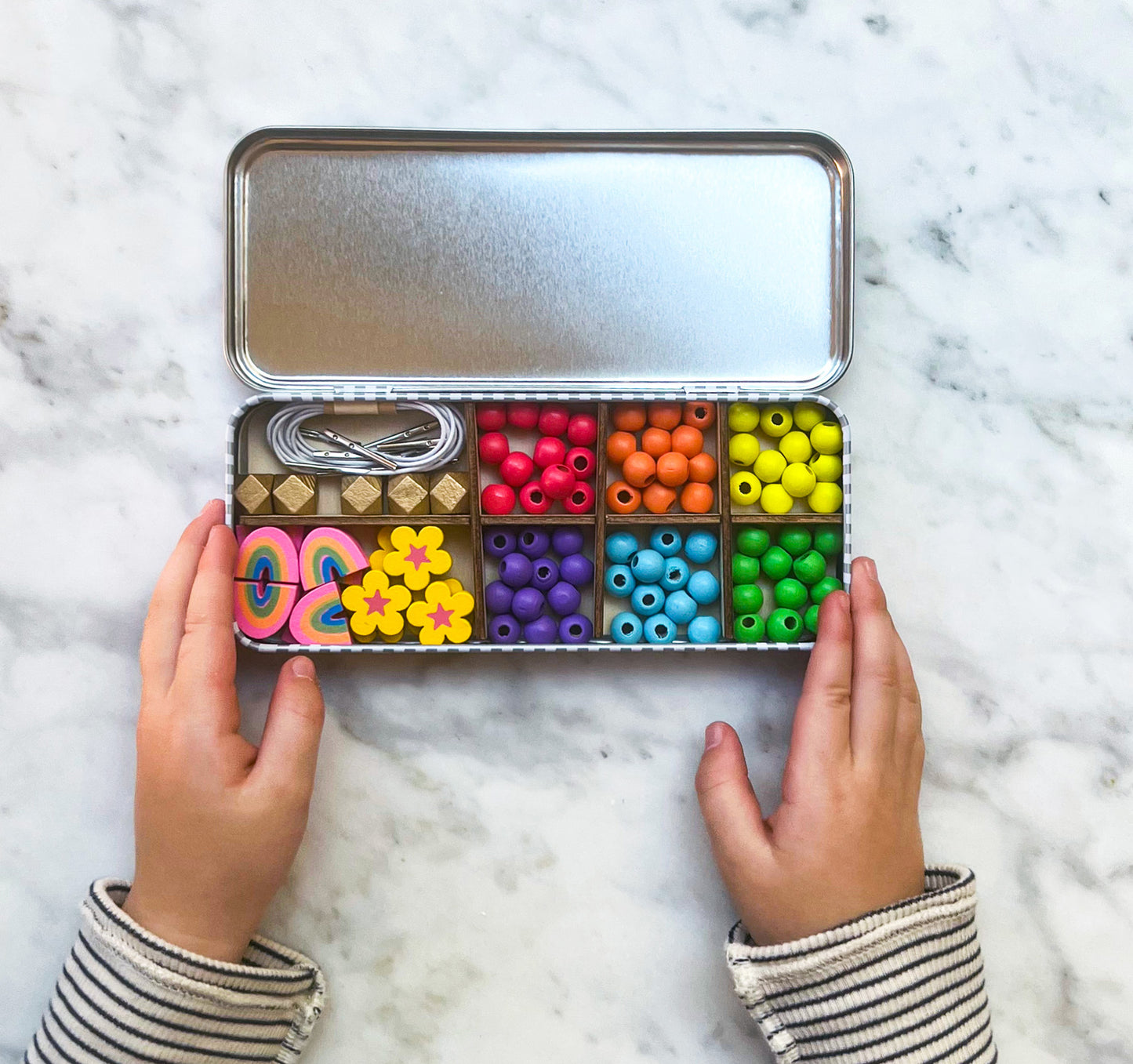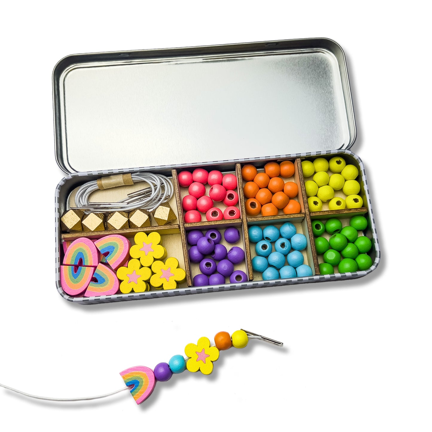 The rainbow bracelet beading kit is perfect for three to eight year olds. Containing enough beads to make 5 bracelets, a selection of rainbow, flower, gold geometric & colourful spherical beads await. Children can wear the bracelets with their favourite outfits, gift them to friends they love, or make them with friends at a party.