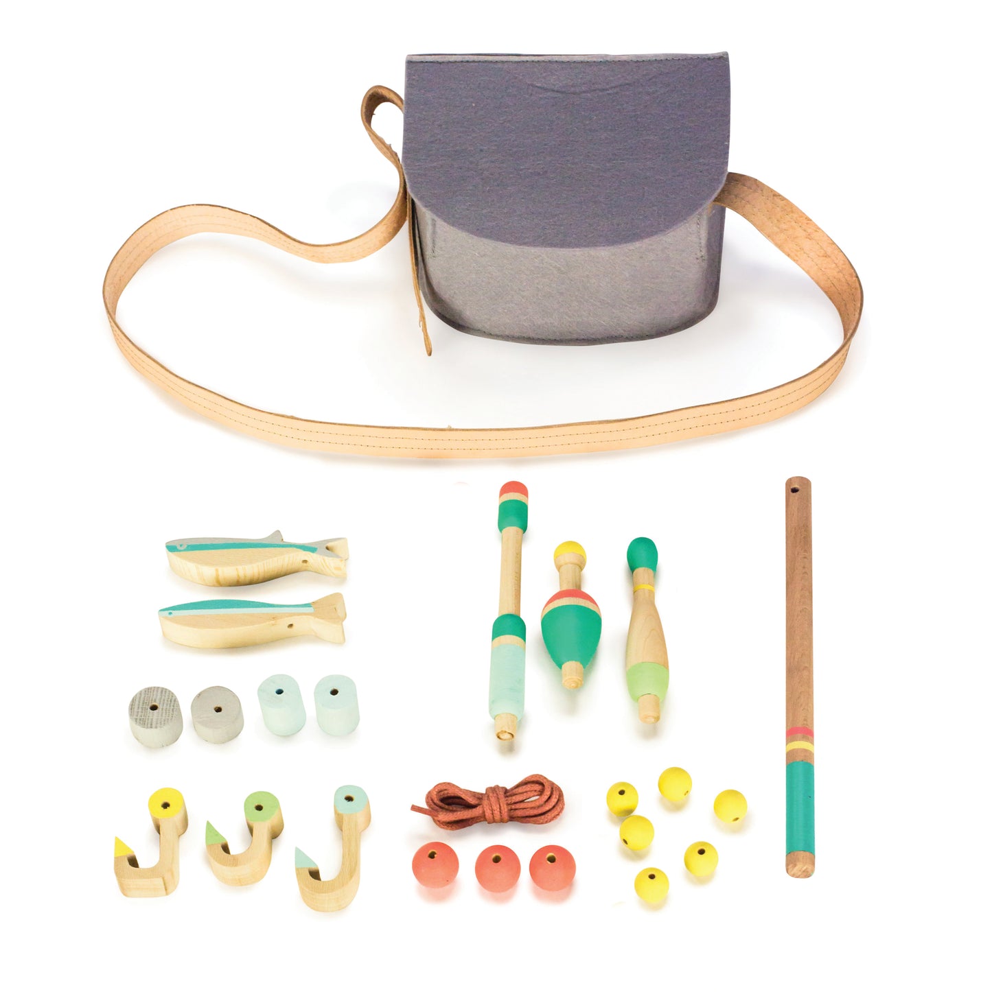 You can find everything you need for fishing in our handcrafted fishing bag. Fix the string, the hook, the float, the lead and the bait onto your fishing rod, put the fishing bag on your shoulder and you are ready to go fishing!