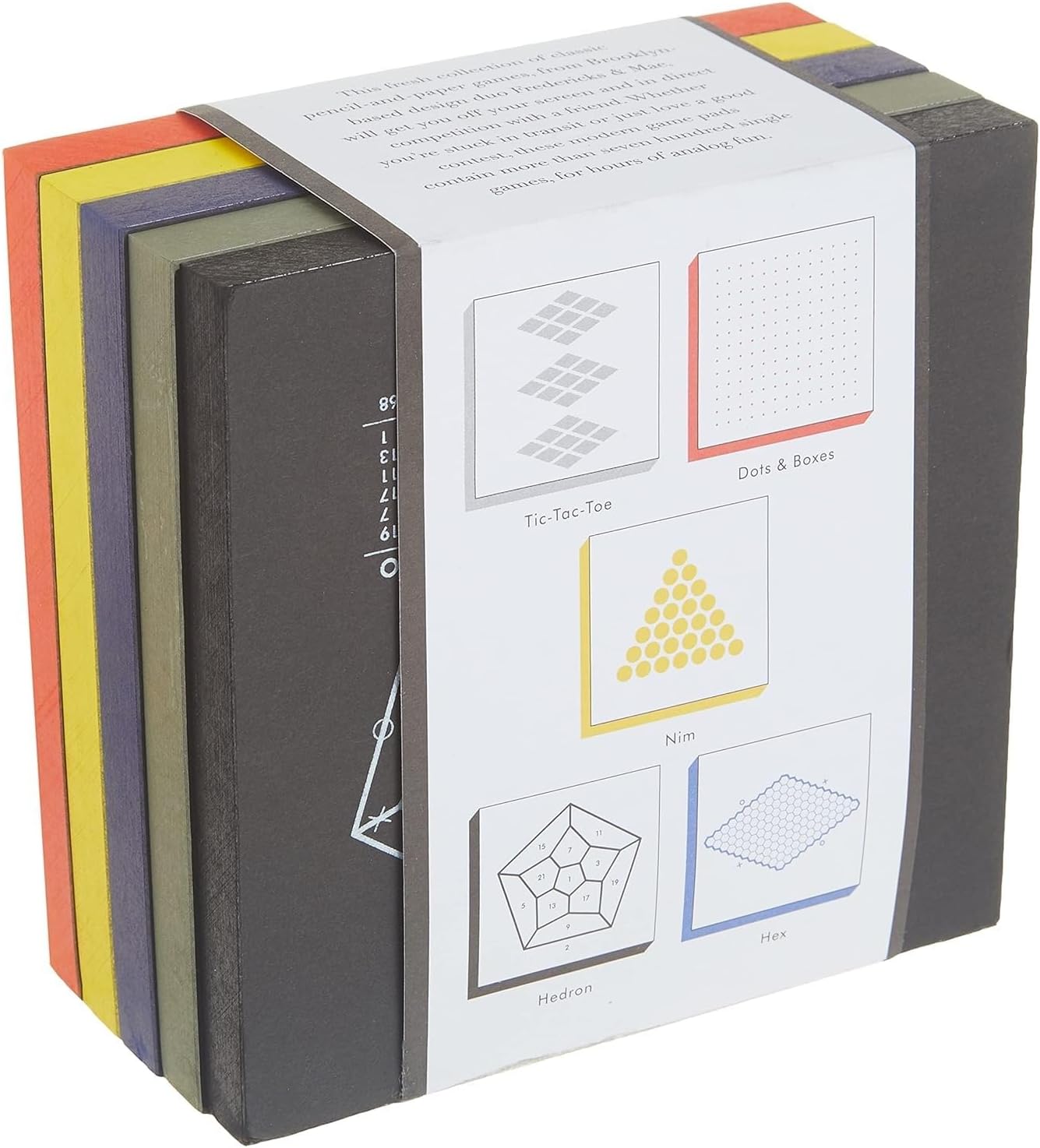 Put down your smartphone and pick up a pencil! This fresh interpretation of classic paper and pencil games features five tear off pads with colorful edging and sleek modern graphics. The set includes five two player games, some familiar and some new: three dimensional Tic Tac Toe, Dots & Boxes, Hedron, Nim, and Hex. Each pad has 150 sheets for a total of 750 single games, enough to keep players of any age happy for hours!