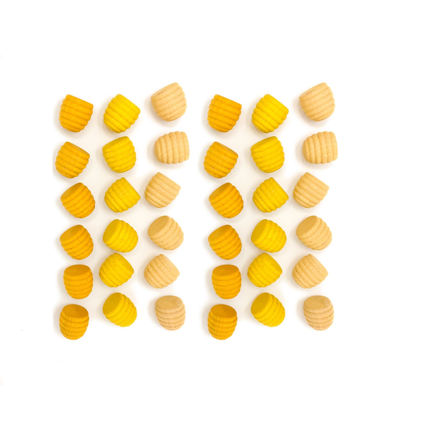 The mandala collection invites children to create mandalas, individually or collectively. They can also be used to create pictures and representations. Depending on the needs of the kids, they can enrich symbolic play, they can be use as food for cooking or elements to transport. When the kids are older and in the phase of concrete learning, mandala pieces can be of help with counting, lining up, or creating letters... just let them surprise you!