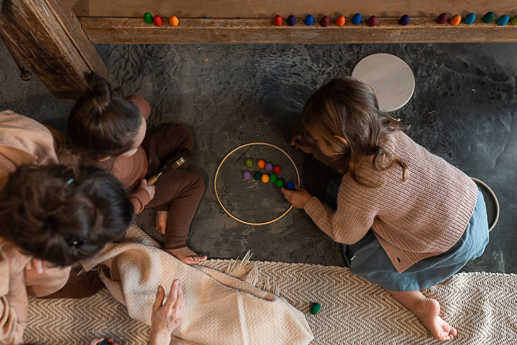The mandala collection invites children to create mandalas, individually or collectively. They can also be used to create pictures and representations. Depending on the needs of the kids, they can enrich symbolic play, they can be use as food for cooking or elements to transport. When the kids are older and in the phase of concrete learning, mandala pieces can be of help with counting, lining up, or creating letters... just let them surprise you!