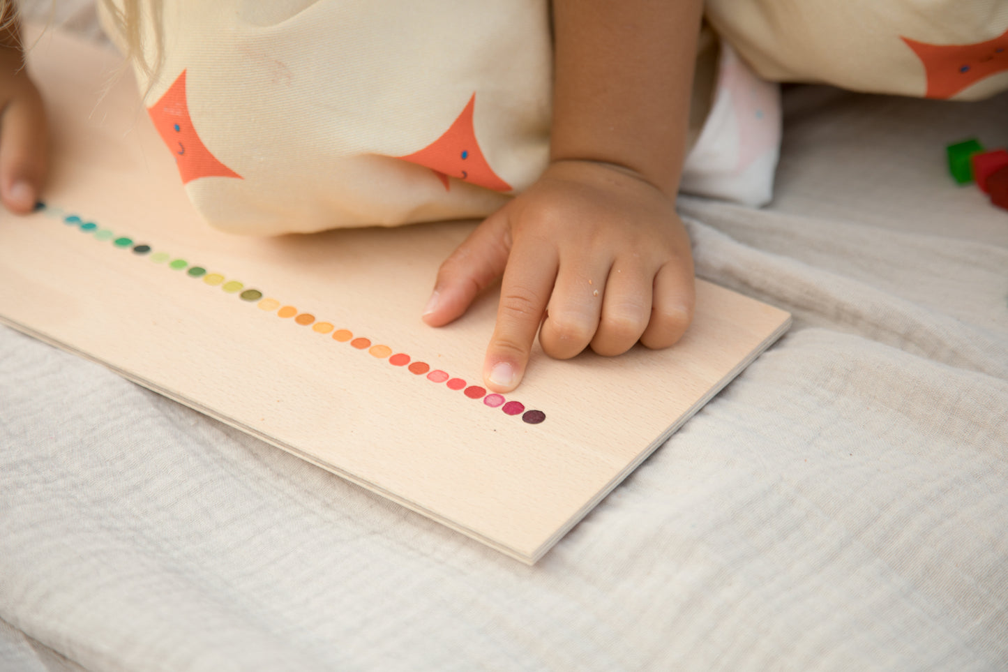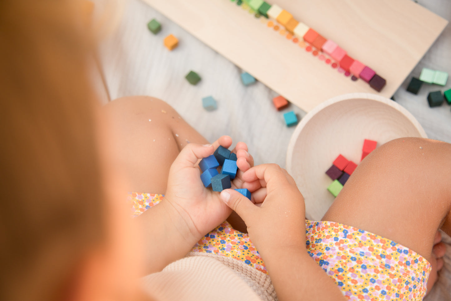 It contains more than 400 small wooden cubes in 36 gradient colours of the rainbow. Includes a hand-painted wooden sorting box.