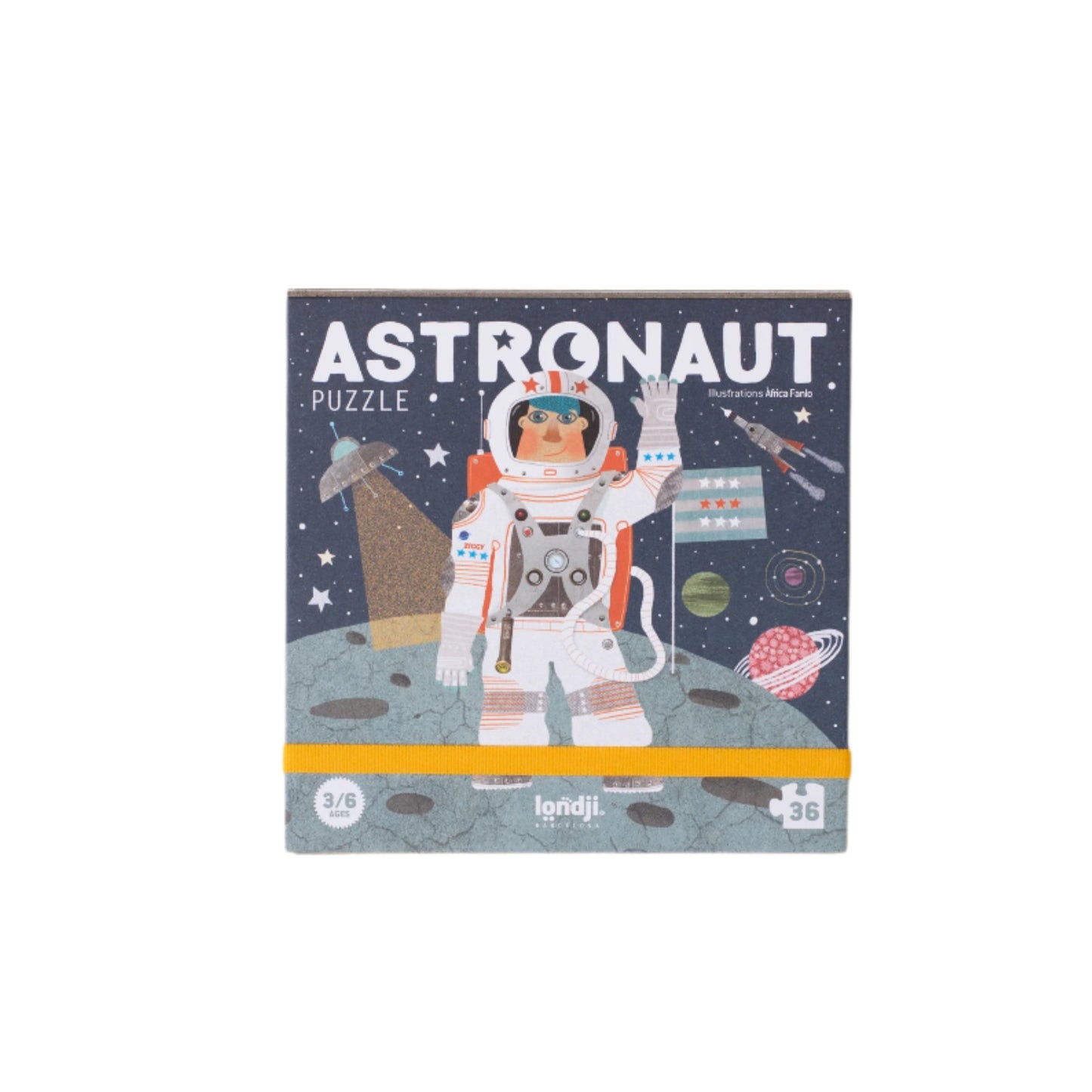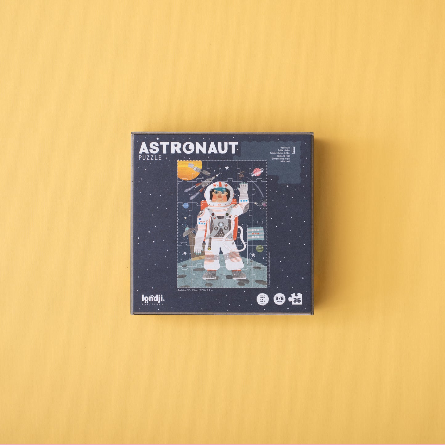 A small 36-piece puzzle of an astronaut in space, planets and spaceships. A comfortable pocket-sized version, includes a nice cotton bag.
