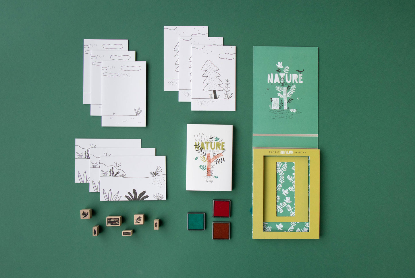 The game includes 6 wooden stamps, 9 fold-out sheets and inks in 3 colours.
