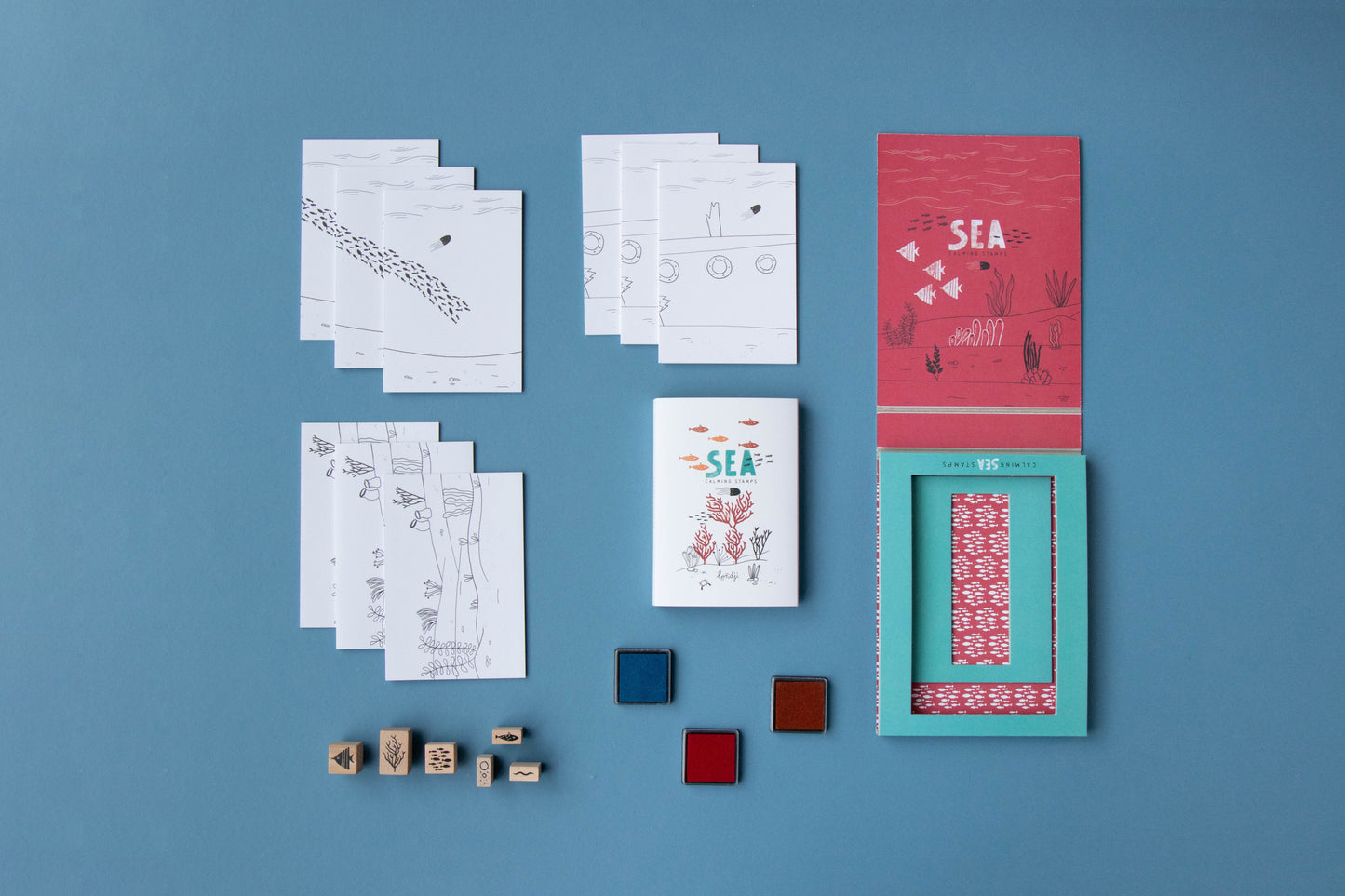 The game includes 6 wooden stamps, 9 fold-out sheets and inks in 3 colours.