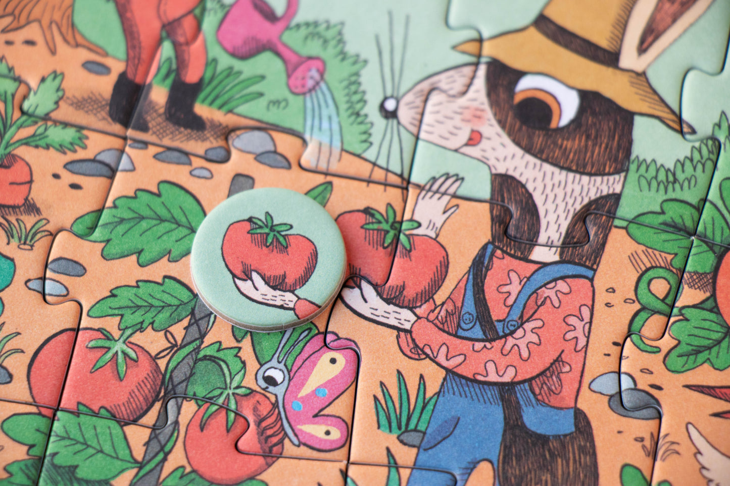 A small 24-piece puzzle that includes 12 observation pieces to learn about the garden, fruits, and vegetables! A pocket-sized puzzle to take anywhere.
