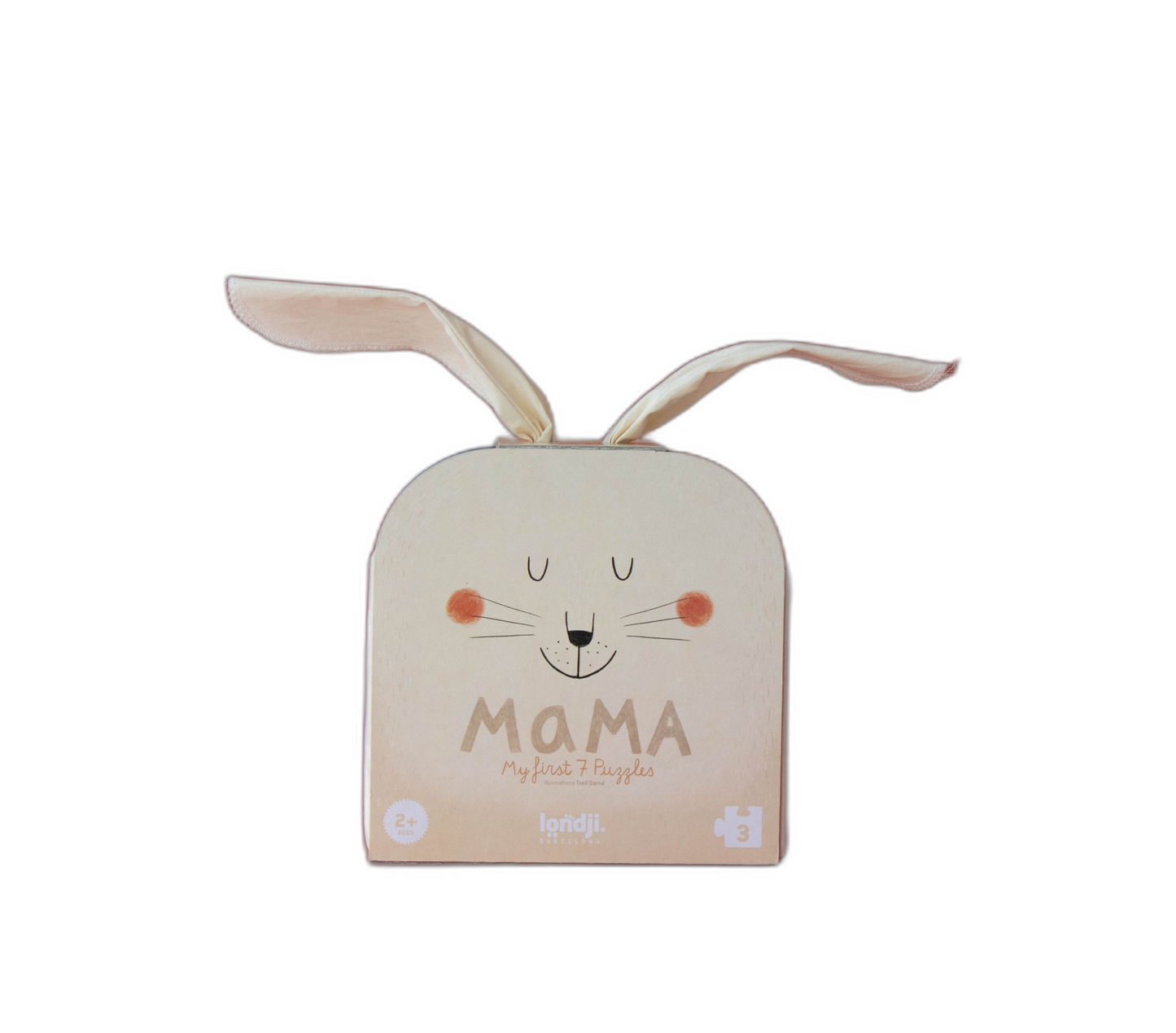 7 puzzles of 3 large pieces with illustrations of different animals hugging their babies.