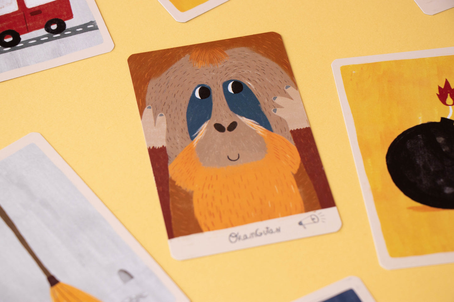 A game where you can remember the sequence of sounds and gestures that are created by all the players from the images on the playing cards. 3 orangutan cards must be obtained before the bananas run out!