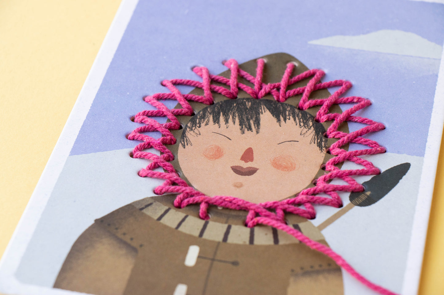 An embroidery kit with everything you need to learn to sew: coloured wool, needles that do not prick and 8 cardboard templates.