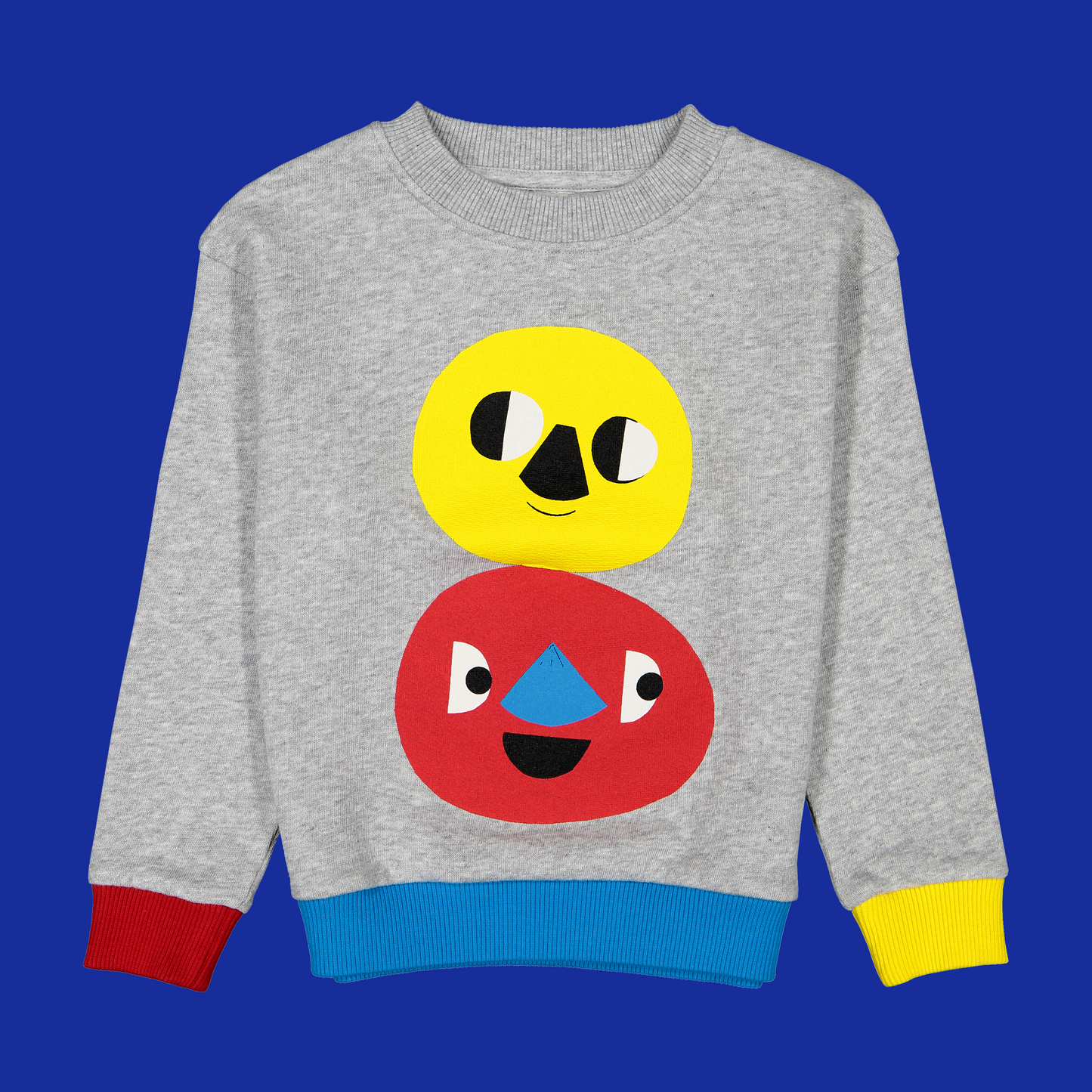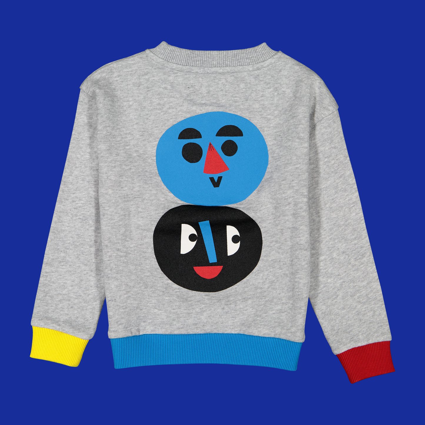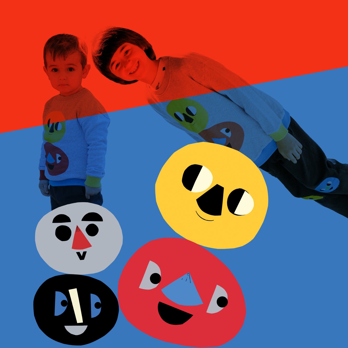 Warm colors at the front, with bright and happy faces representing day and light. Cold colors behind, also with two faces, ready to face the night and the dark.
