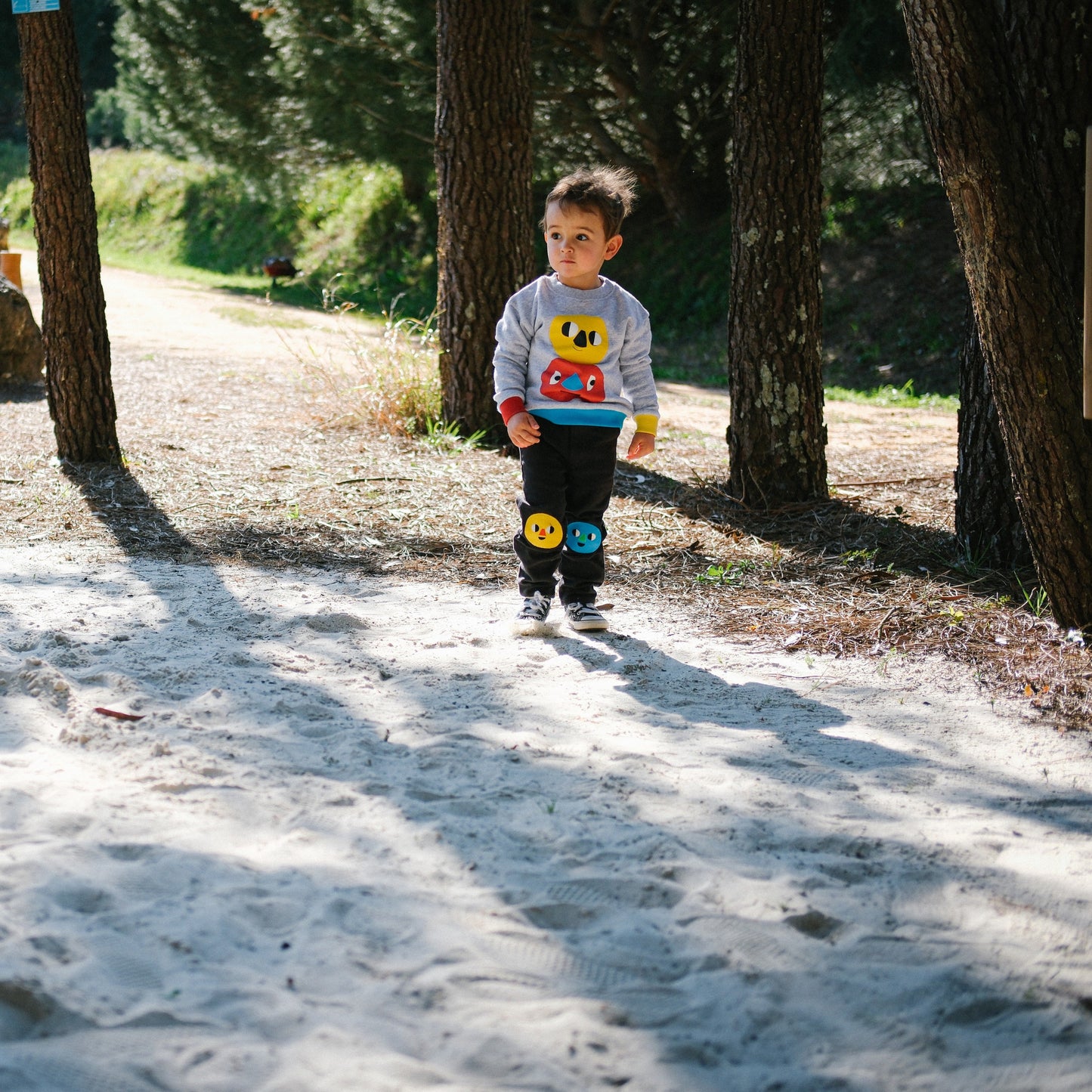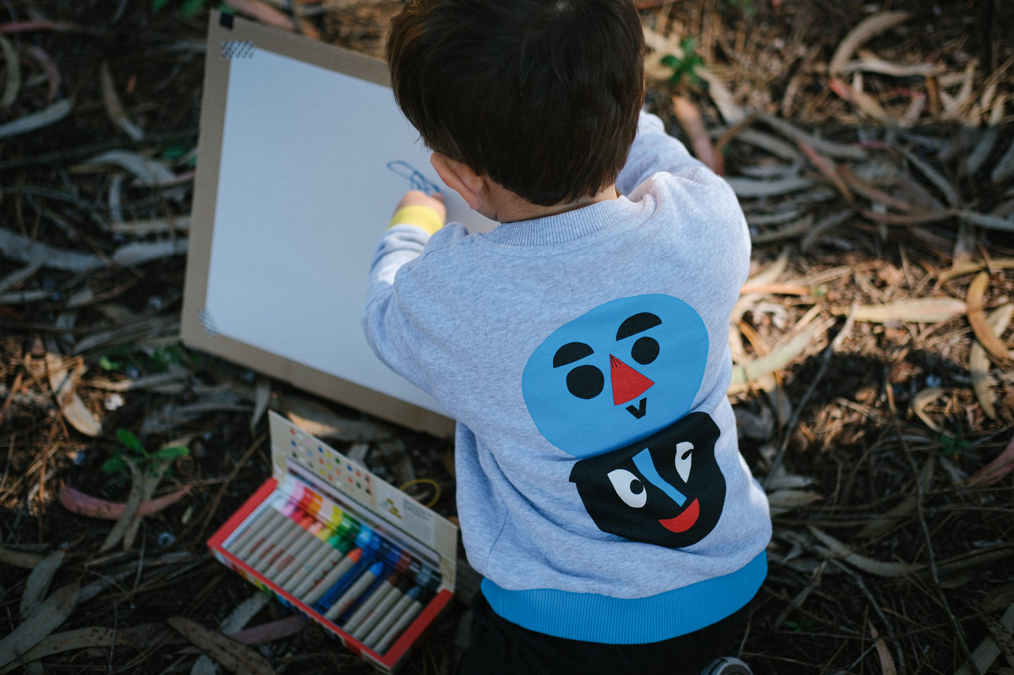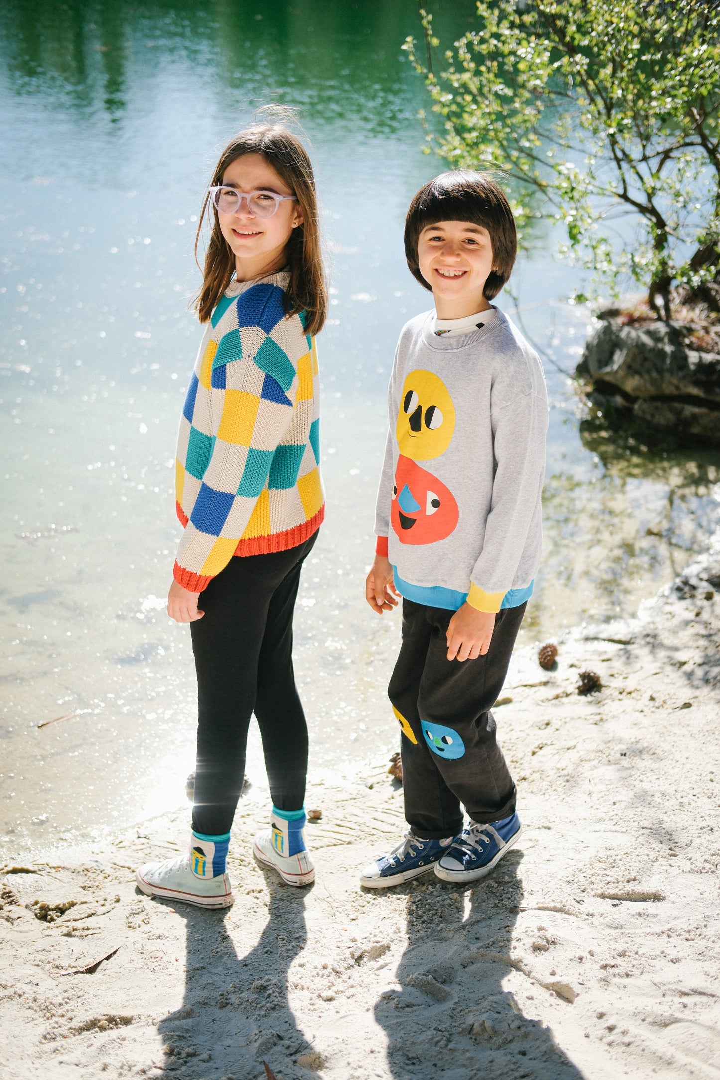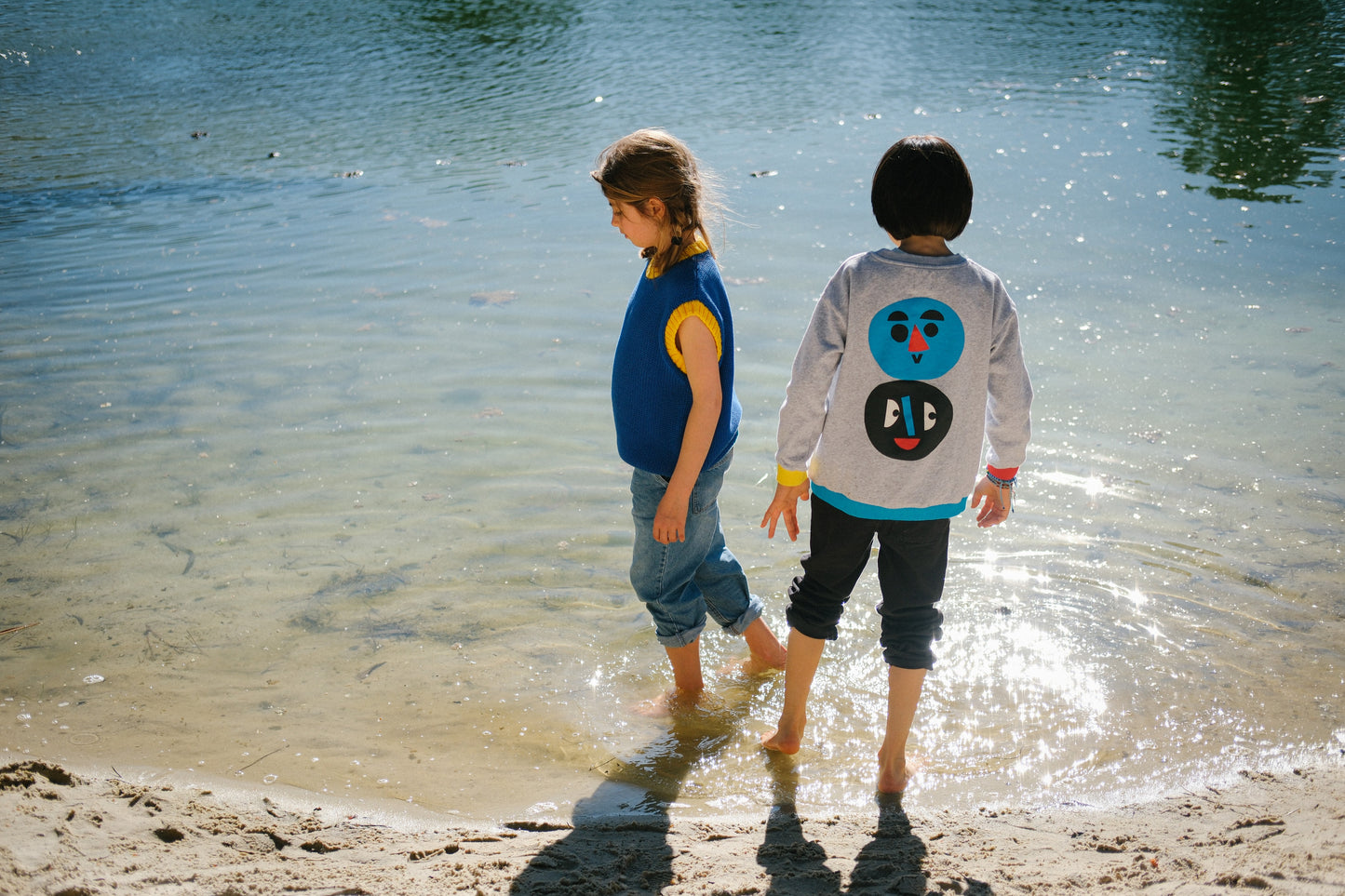Warm colors at the front, with bright and happy faces representing day and light. Cold colors behind, also with two faces, ready to face the night and the dark.