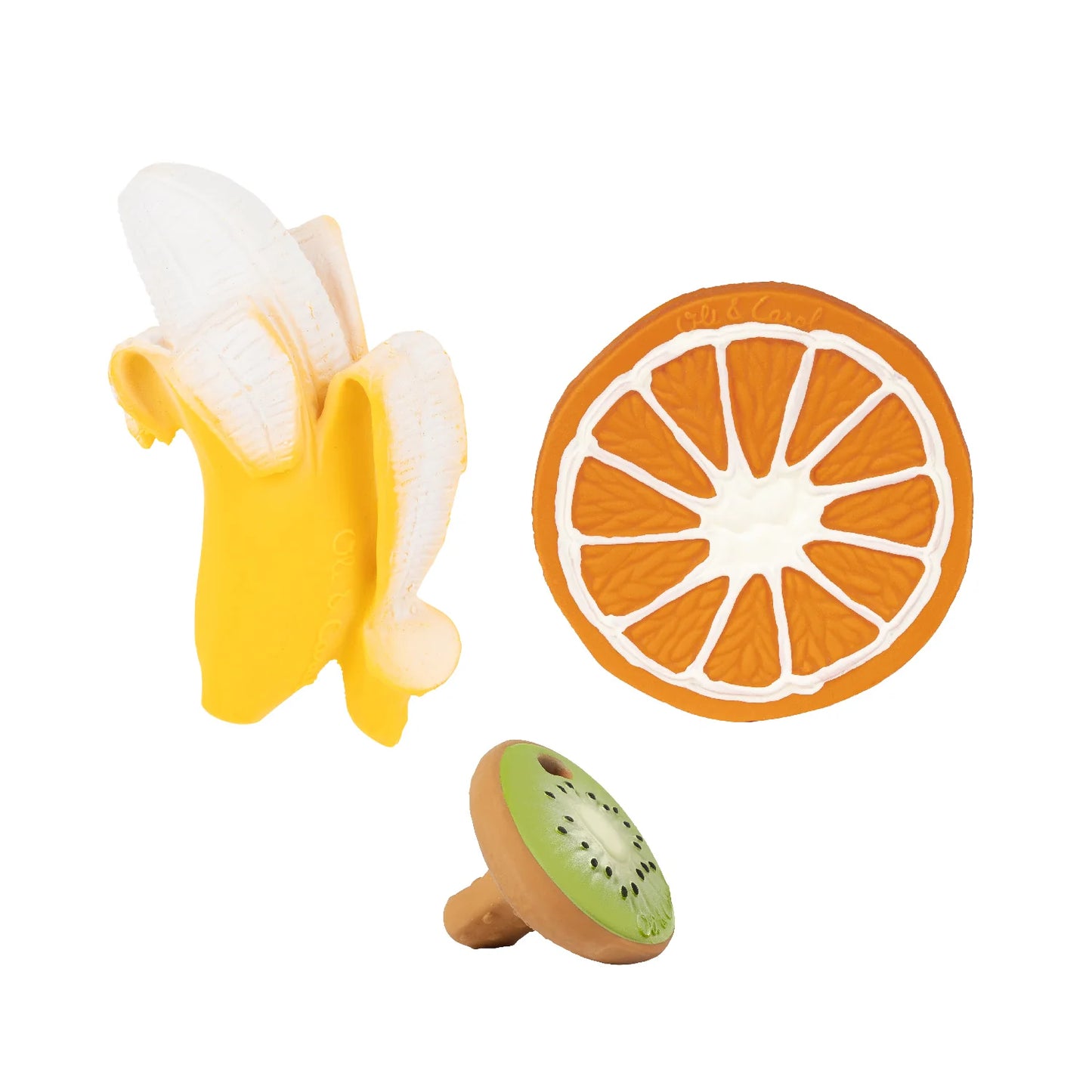 Let's go bananas! This baby gift set includes two baby teethers for babies and one mini teether for newborns. All suitable for newborn stage onwards, these designs are the perfect baby gift set to introduce little ones into healthy habits while promoting sensory development and soothing teething gums.
