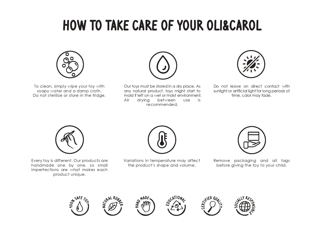 This product is perfect as a baby teether, babies and kids toy, bath toy, for sensory play and decorative object. It is made following an artisanal, sustainable and eco-friendly process with 100% natural rubber from Hevea trees. As it is made all in one piece with no holes, it avoids the creation of bacteria inside. Hand painted with natural pigments one by one, so there are no two alike!