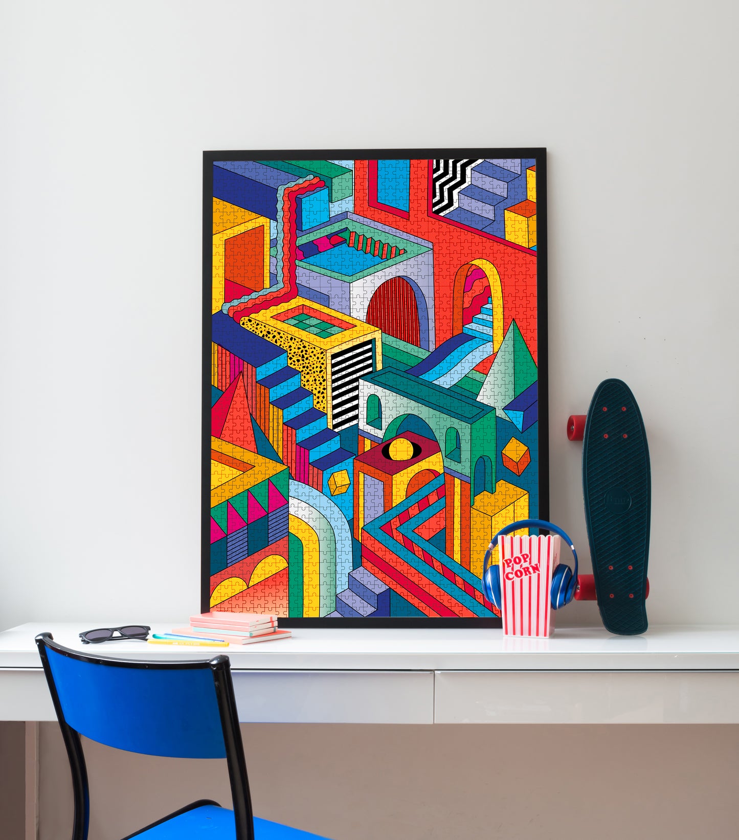 A puzzle of 1000 pieces that invites you to dive into the vibrant colors of a graphic architecture, the cube box puzzle is a great gift for good times! A graphic puzzle collection designed for bigger ones.