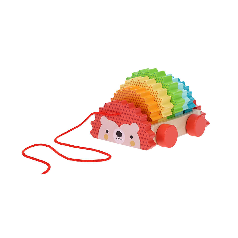 Hello, Hedgehog! Sort and stack the wooden shapes to bring your rainbow hedgehog to life, then take your sweet new friend for a soothing stroll. The five bright and chunky rounded blocks fit snugly into the pull-along tray, making it easy to maneuver and simple to store.