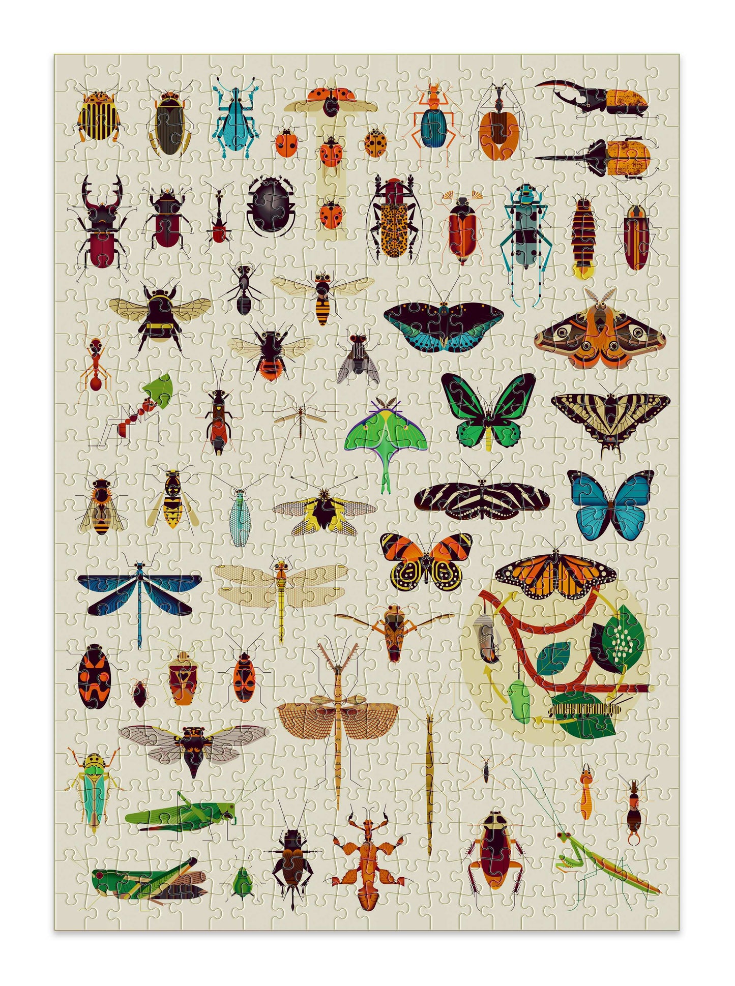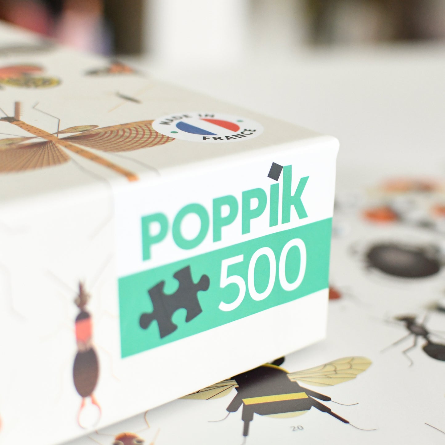 This 500 pieces puzzle is based on the design of one of the iconic posters of the Poppik brand. Find the most famous insects like the bee, the praying mantis, the gendarme, or colorful butterflies.