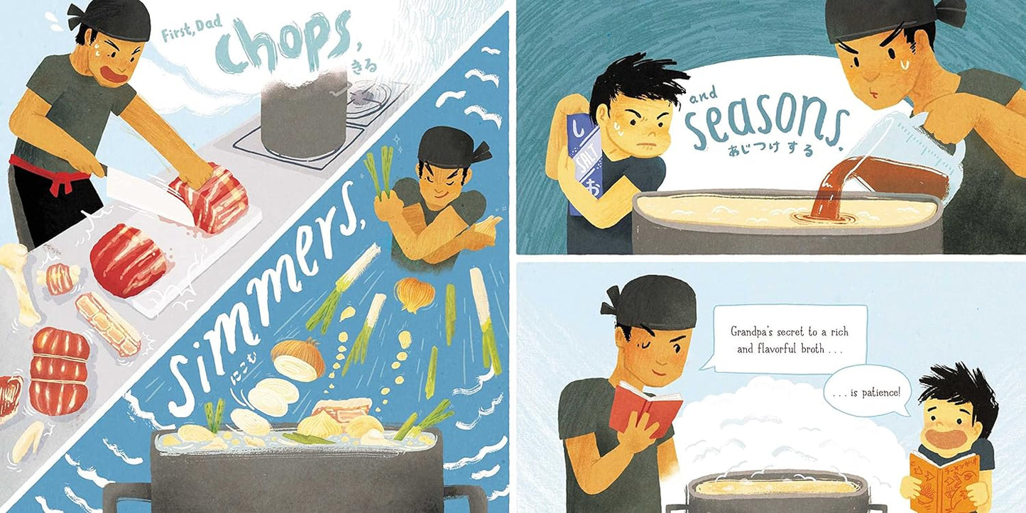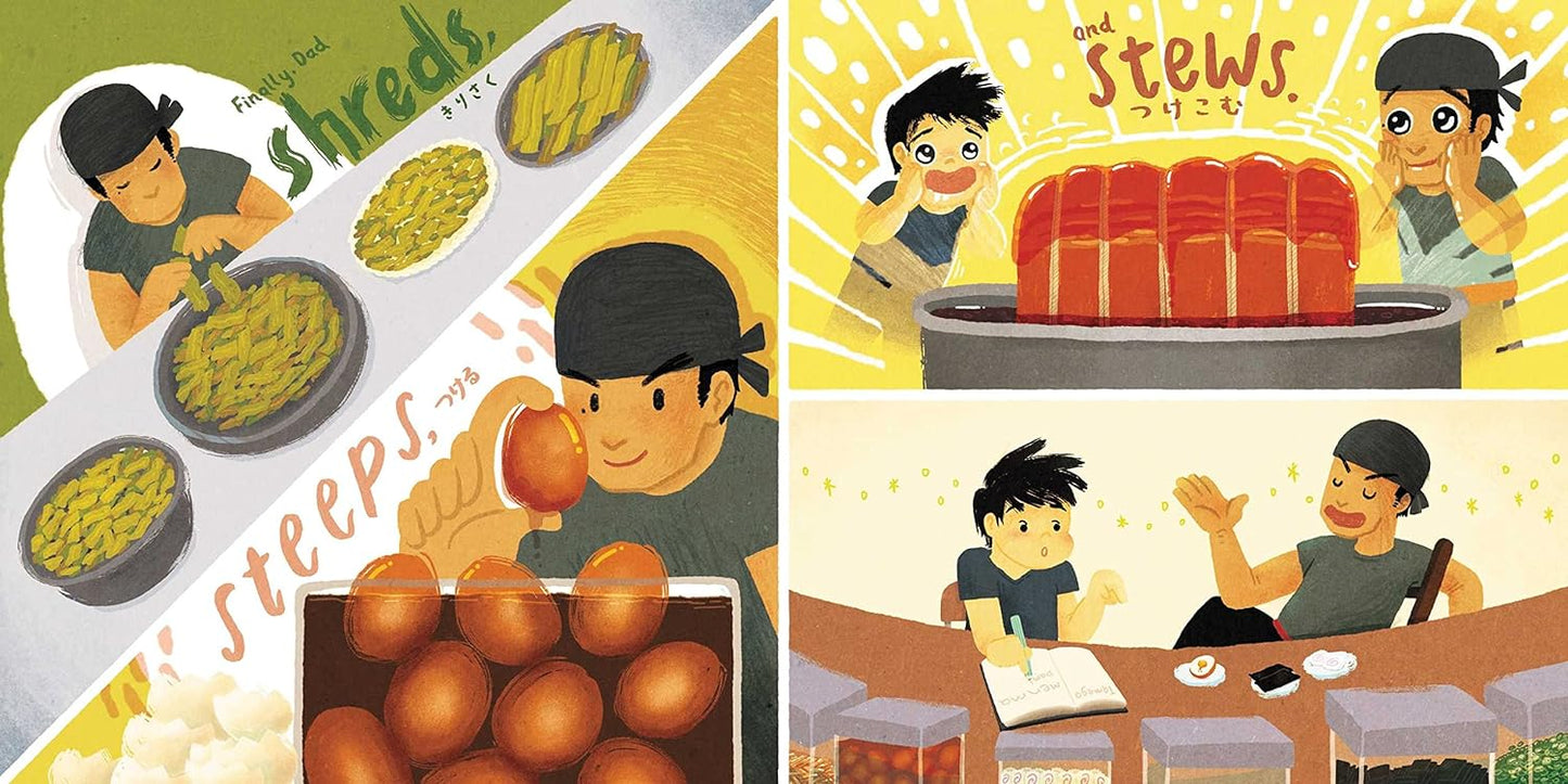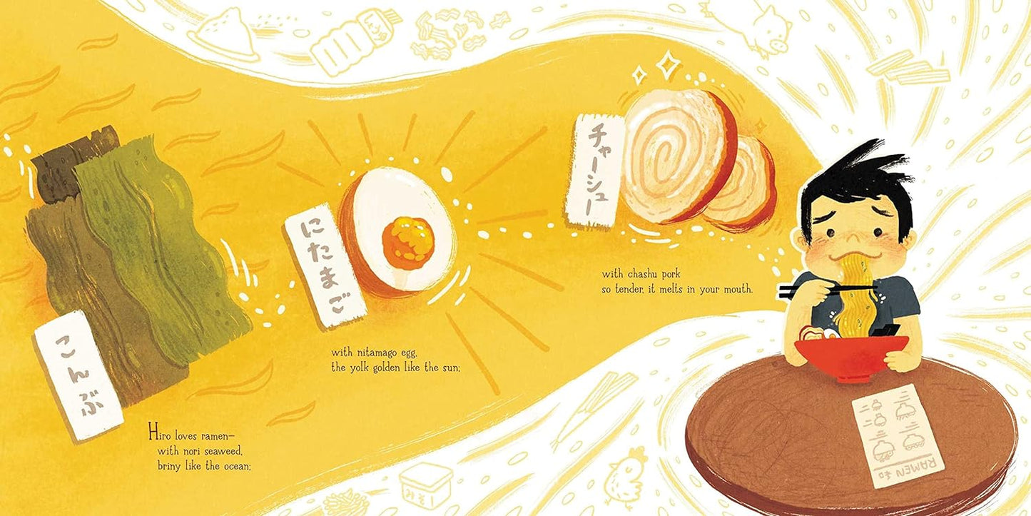 Hiro loves ramen. Every Sunday, Hiro’s dad makes delicious, perfect ramen for dinner, using a recipe passed down from his dad. There’s nori seaweed, briny like the ocean; nitamago egg, the yolk golden like the sun; and chashu pork so tender, it melts in your mouth. Yum!