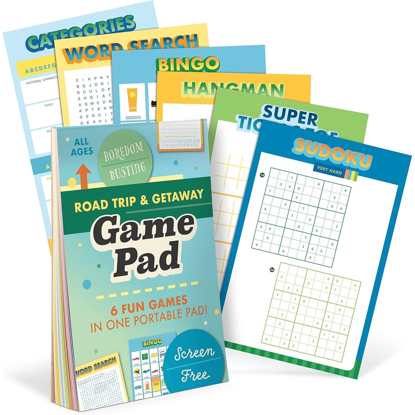 - Includes: one portable car activities pad including 6 games, 10 sheets each: Sudoku, Super Tic-Tac-Toe, Hangman, Bingo, Word Search, Categories