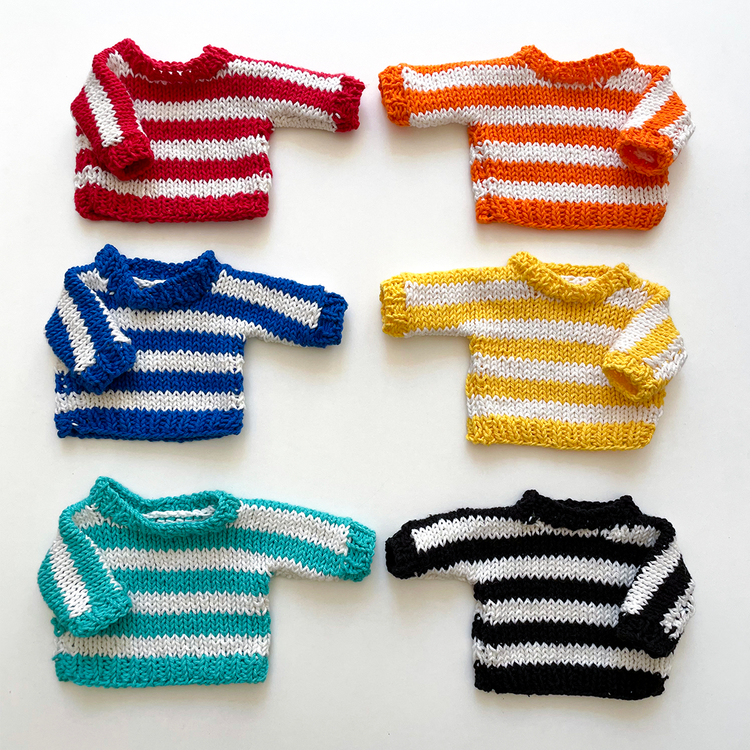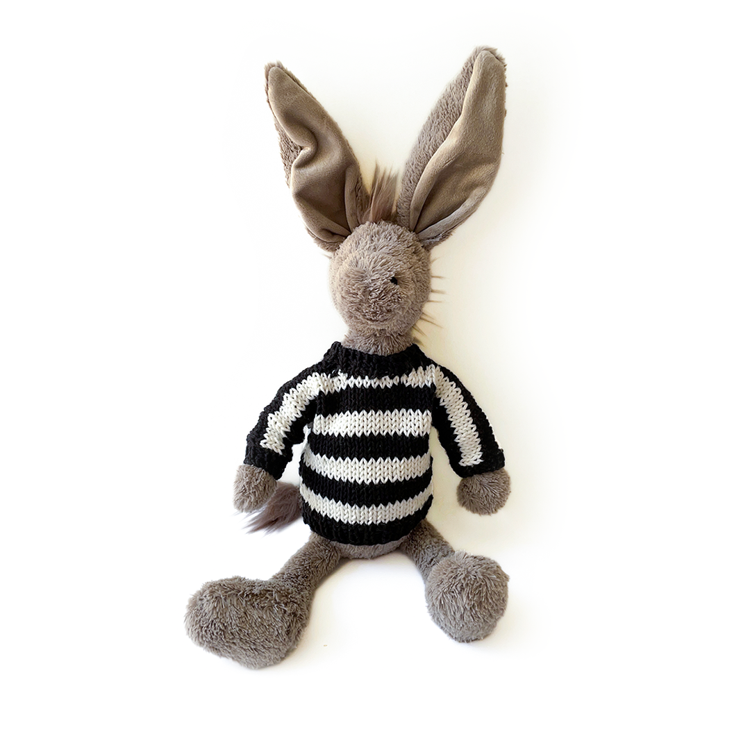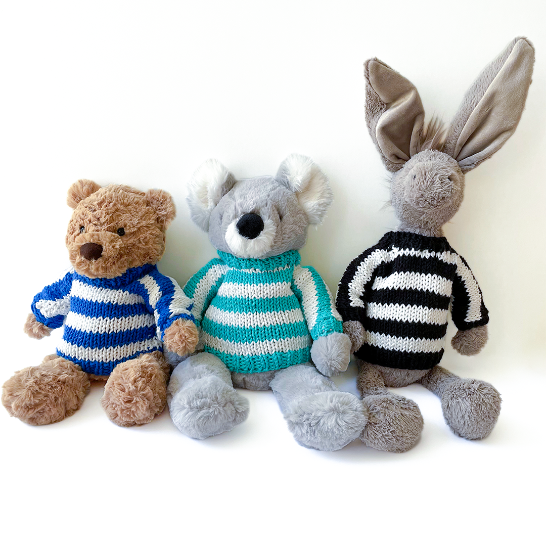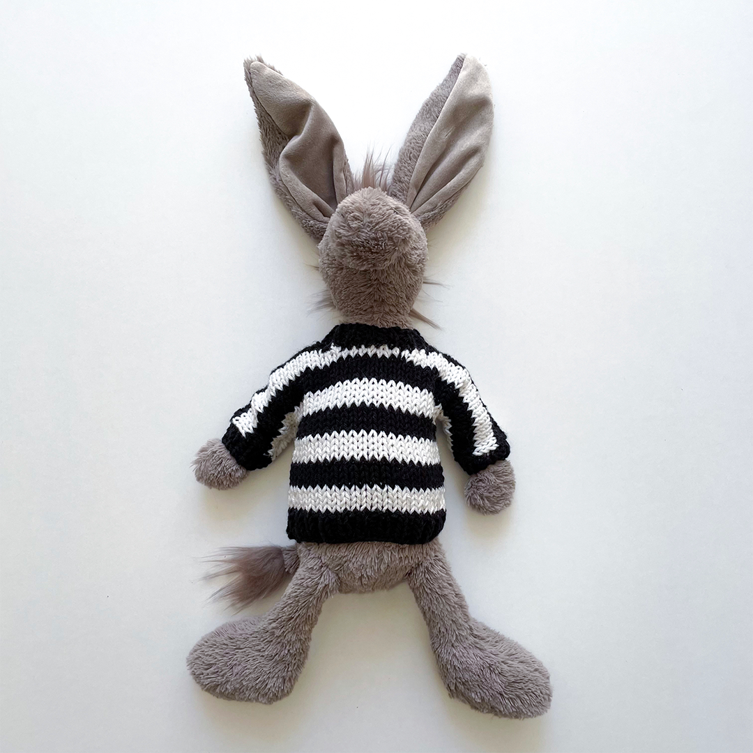 The sweater has a unique size adapted to JellyCat soft toys (about 30cm). Fits all our soft toys except the octopus. Depending on the stock available, the handmade sweaters may take up to 7 working days to be shipped.