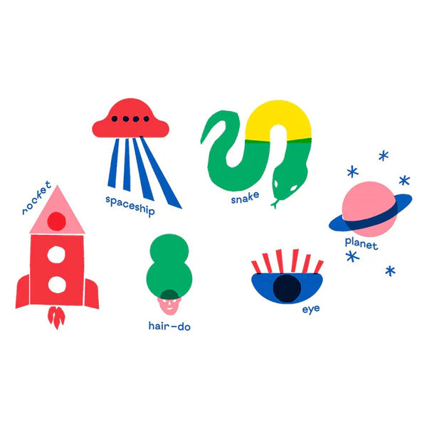 Use six simple stencil shapes to create all manner of fun and wacky designs. From triangle trumpets and cloud circles to anything you can imagine!