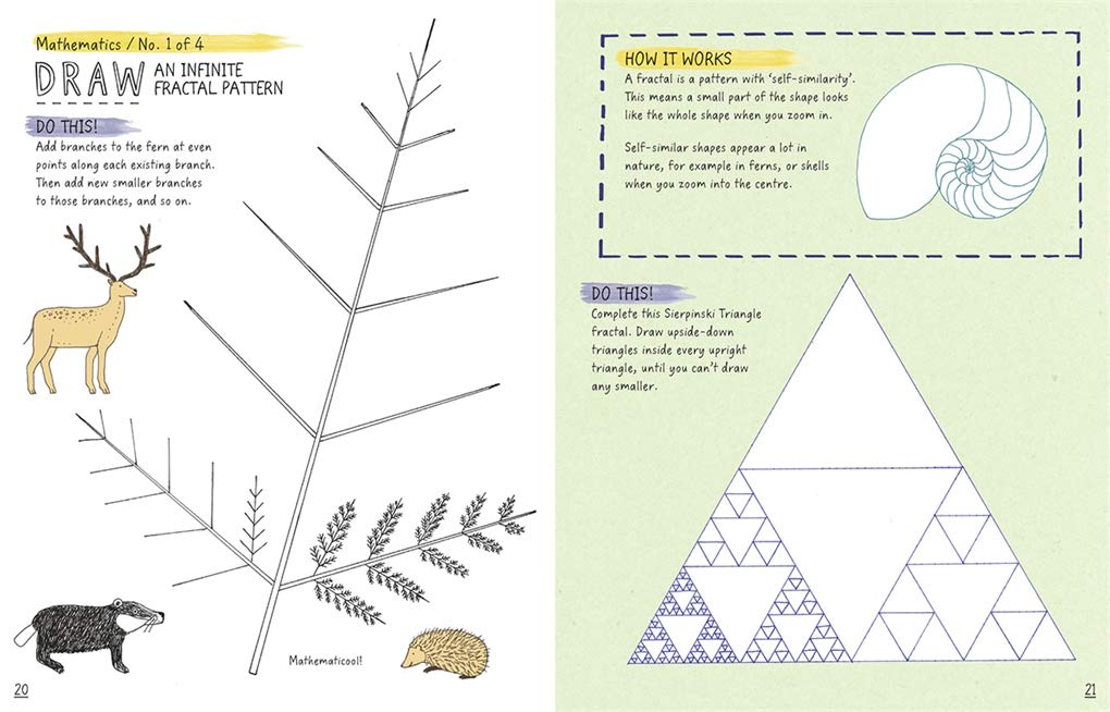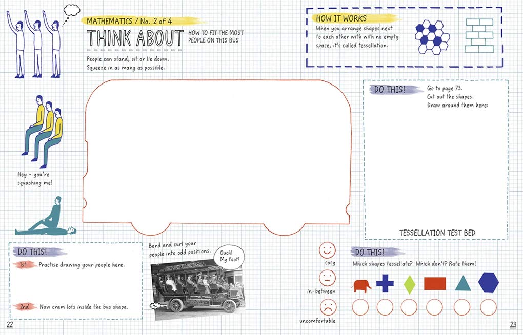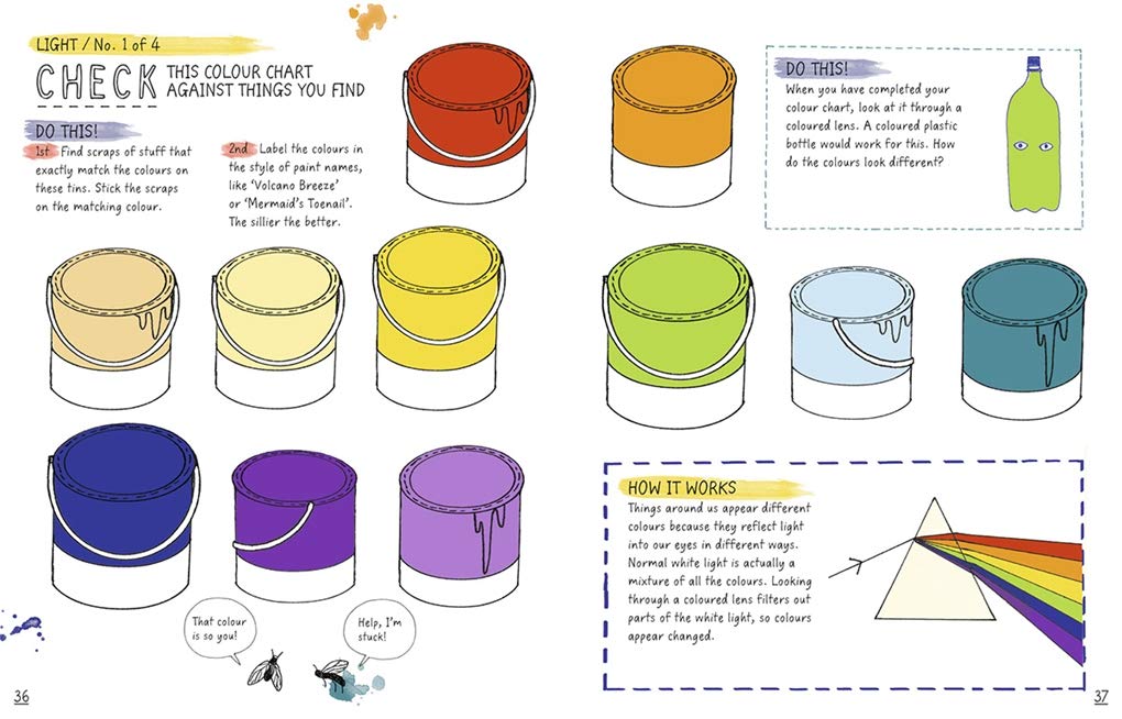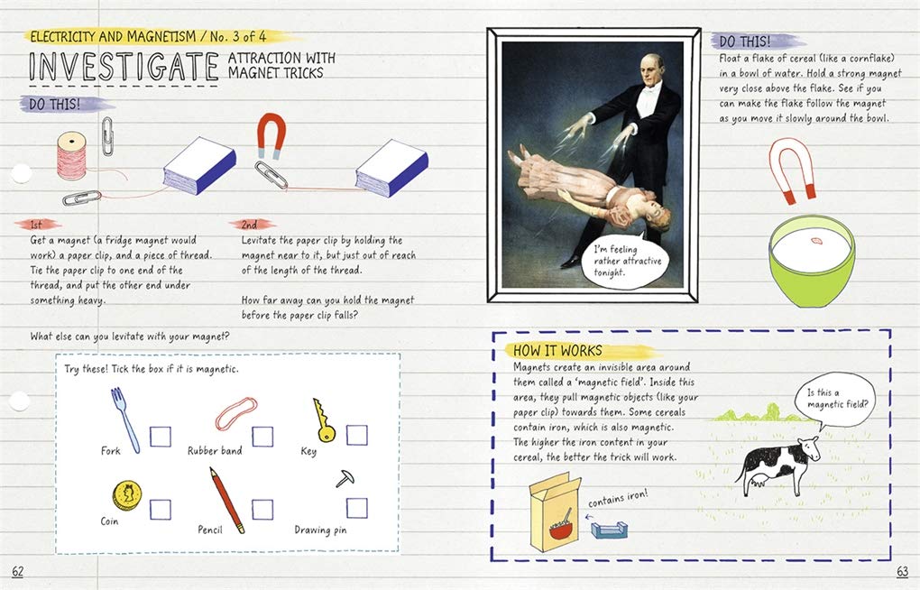 This Book Thinks You’re a Scientist, developed by the Science Museum, London, as a complement to their new interactive gallery for children, explores seven key scientific areas: force and motion, electricity and magnetism, earth and space, light, matter, sound, and mathematics. Each spread centers on an open-ended question or activity, with space on the page for the child to write, draw, or interact with the book. Bend water with static power. Pack a suitcase for a trip to space. Design a new musical instrument. At the end of the book, there is a section for children to record their own guided independent investigations, including surveys and space to log the results of their experiments.