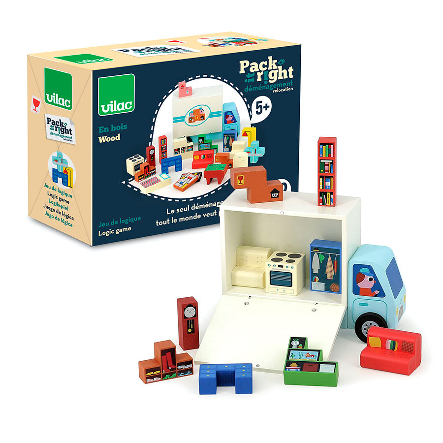 Our wooden "Pack It Right" logic game, illustrated by Ingela P. Arrhenius, invites your child ages 5 and up to organize a house's furniture into a moving truck. A fun concept that will stimulate their logic, fine motor skills, and organizational skills. The truck and furniture can also be used to create stories, fostering imagination and creativity. An educational and progressive game for family fun.