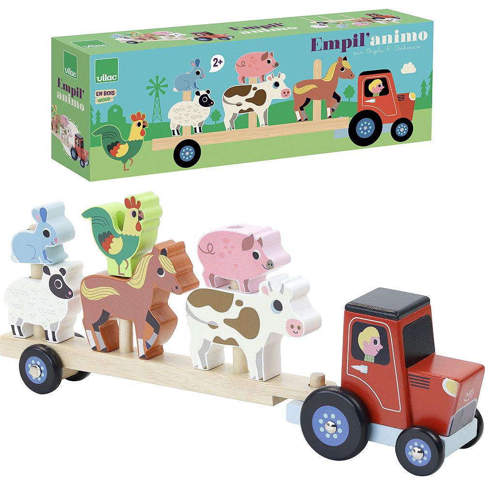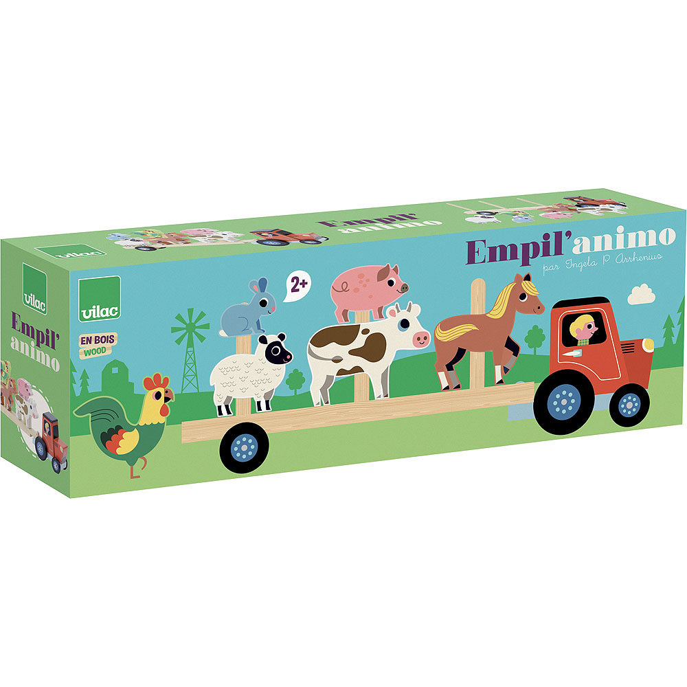 The Vilac wooden toy develops the child's curiosity and fine motor skills and teaches the child about the farm animal. The six wooden animals can be stacked on the trailer, which has three sticks where the animals can be put on. The Wooden toy encourages many hours of play and fun.