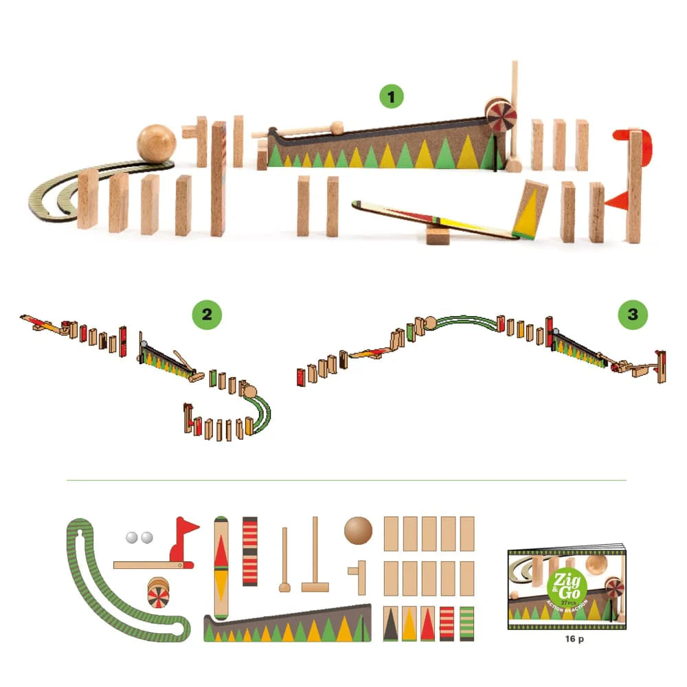 Step-by-step instructions for 3 designs are provided to help children build their courses.