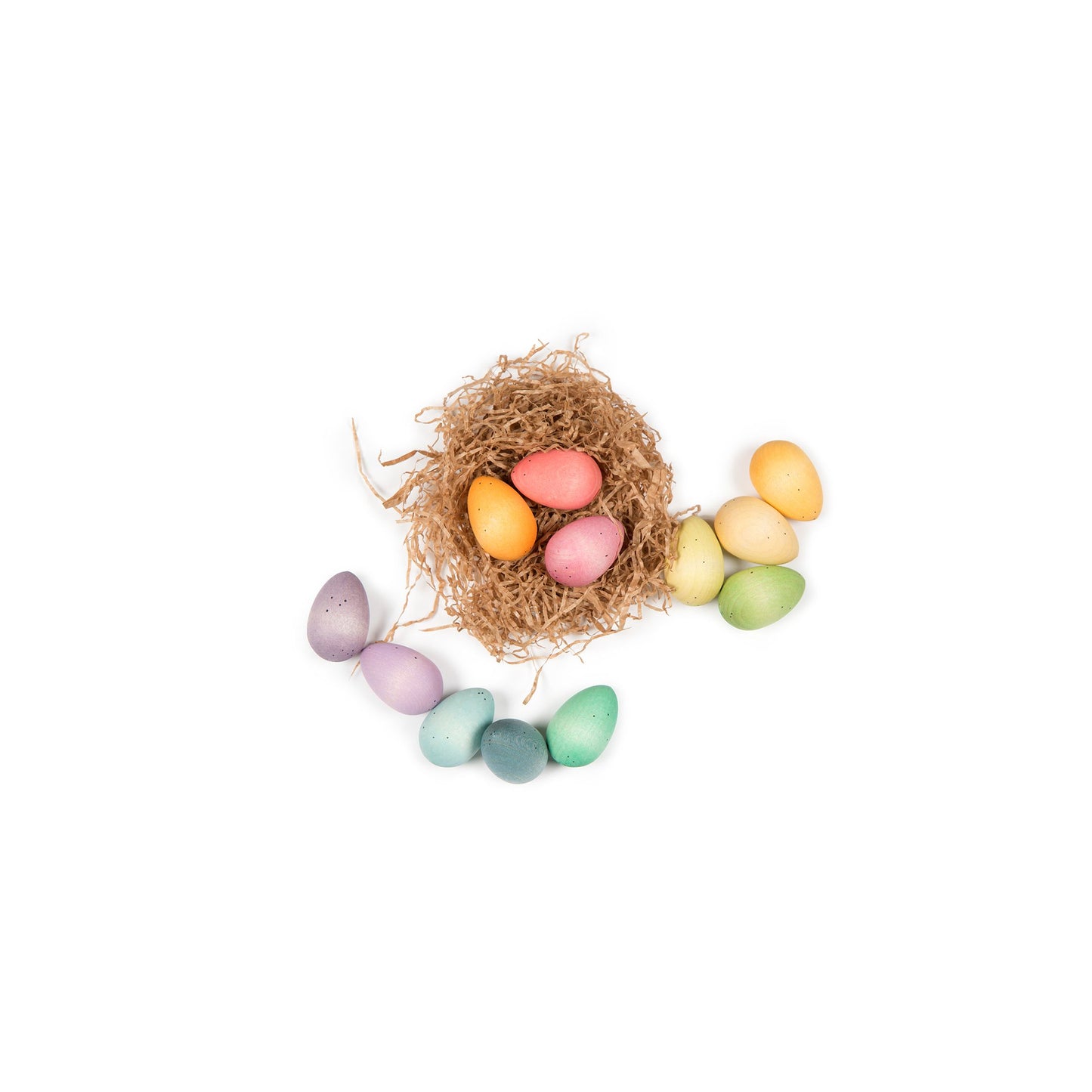 12 ovos que vêm nas 12 cores do arco-íris para celebrar a primavera, enfeitar para a Páscoa, cozinhá-los na cozinha lúdica ou transportá-los num camião.