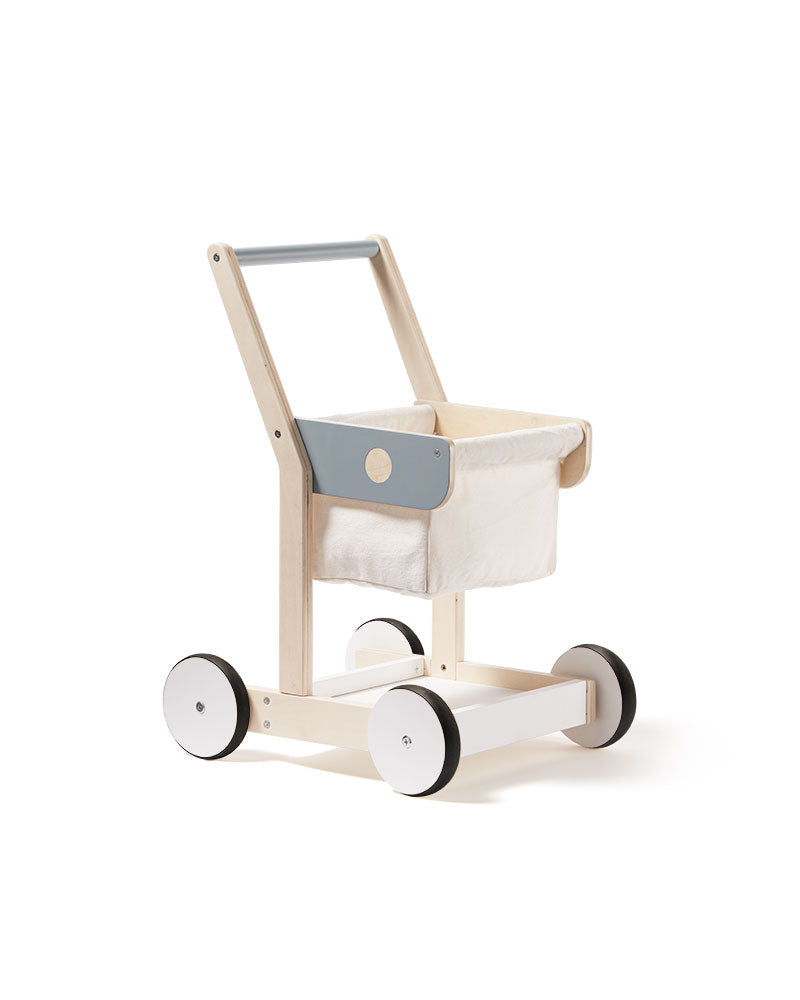 Carrinho de compras em madeira com a caixa de arrumação em 100% de algodão. Um excelente brinquedo do " faz de conta" que incentiva a mobilidade para a loja de brincar de qualquer criança. Usa a cesta superior e a bandeja inferior para colocar os alimentos enquanto passeia nas ilhas!