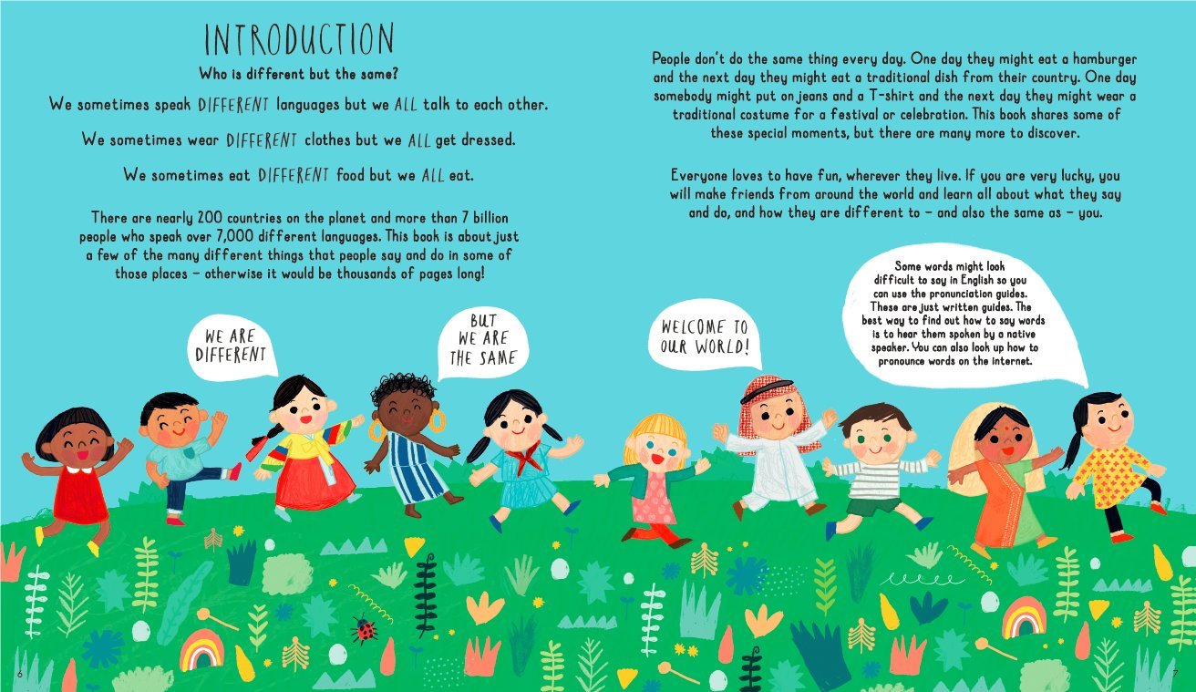 Neste livro com uma ilustração maravilhosa, as crianças pequenas podem aprender tudo o que as pessoas de outros países comem, vestem, brincam, e como falam e celebram. Desde o pequeno almoço ao aniversario, dos bolos às roupas , de soluços a olás , há tantas formas de dizer as coisas. mas todas transmitem amor e família, amigos , comida e diversão. Este livro delicioso ensina que apesar das diferentes línguas , costumes e tradições , o mundo é realmente pequeno.