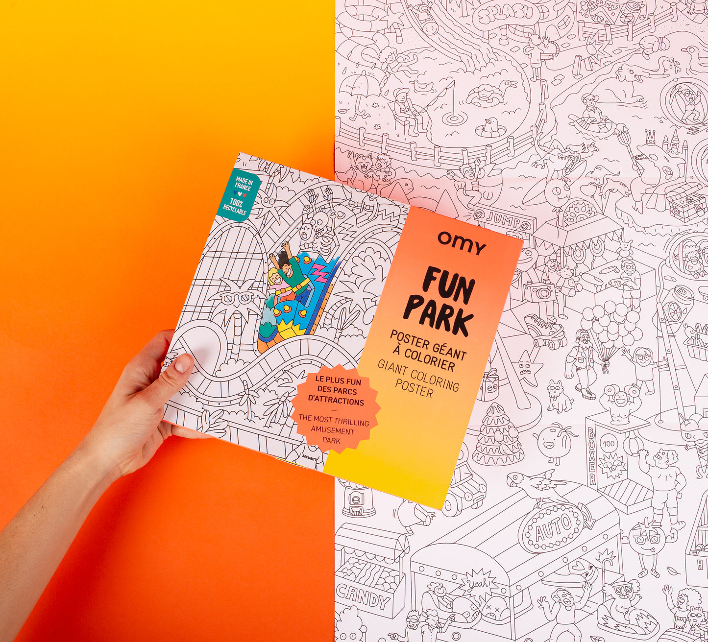 Dobrado numa bolsa colorida, este poster leva-te a descobrir o maravilhoso mundo das feiras: a roda gigante, os carrinhos de choque, a montanha-russa, o algodão doce e as maçãs doces...