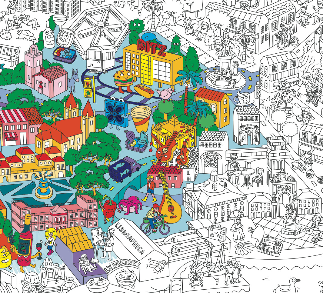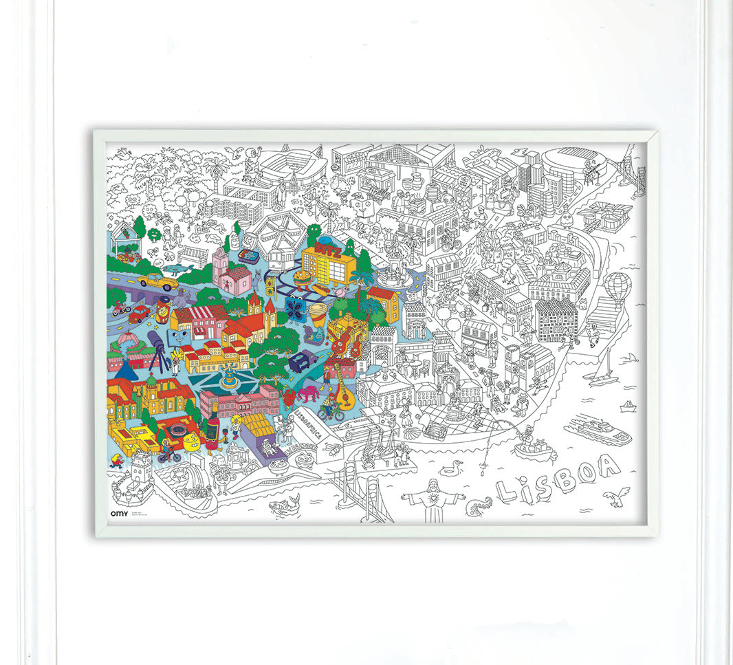 Este poster leva-te a descobrir a capital de Portugal colorindo: bairro de Alfama, Torre de Belém, Elétrico 28, mercado de Alvalade, a ponte ....