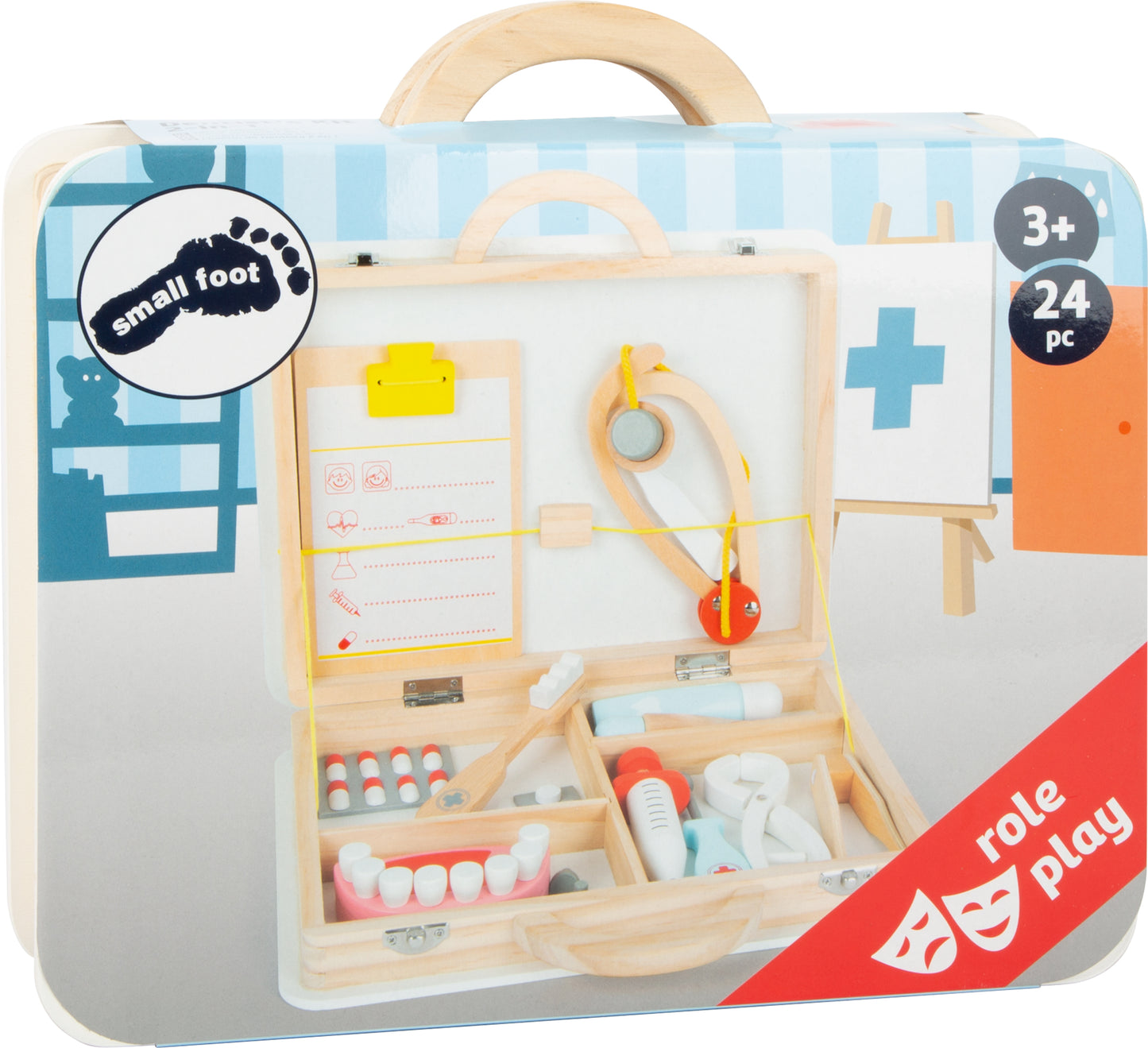 As cáries não têm chance ! Equipado com uma seringa de brincar, uma broca, uma escova de dentes, um kit de dentes removíveis, pasta de dentes, e fórceps, , certifique-se de que neste kit de madeira não falta nada ! Este estojo com todos os seus instrumentos em madeira natural e tratada está adaptado ás crianças.