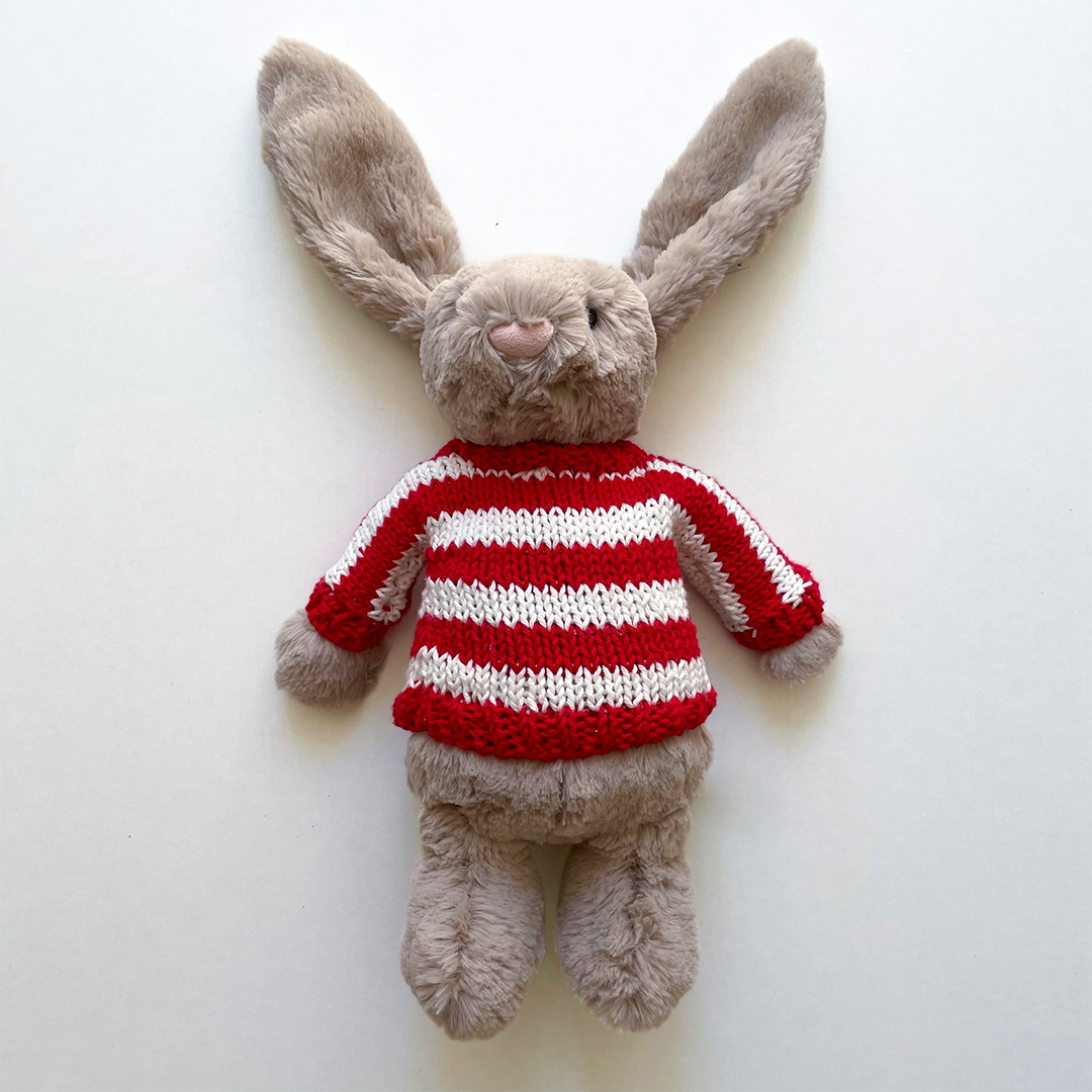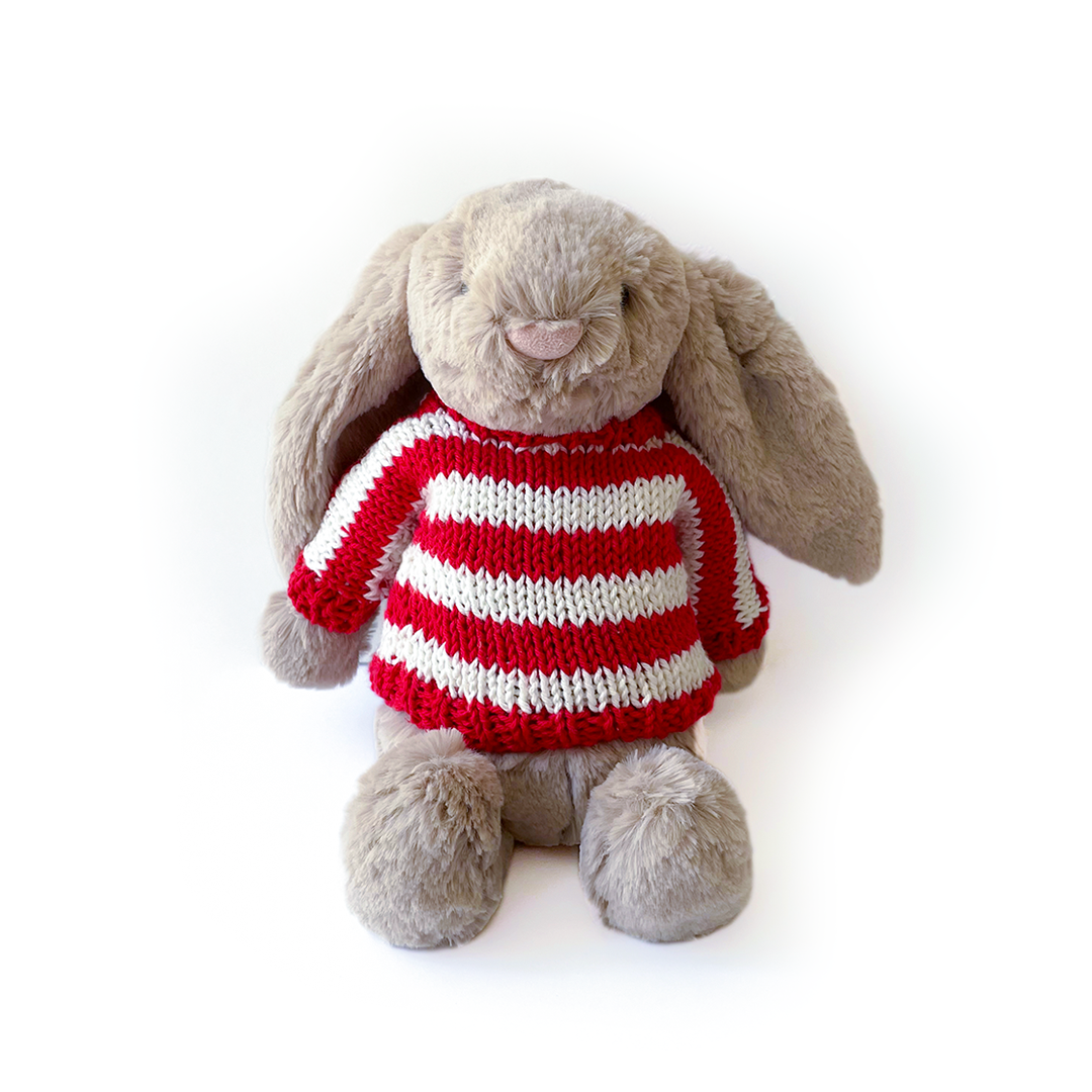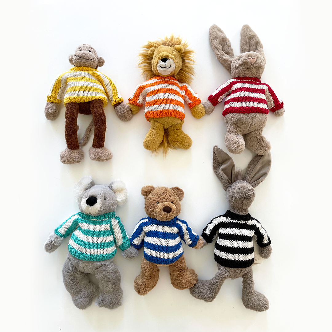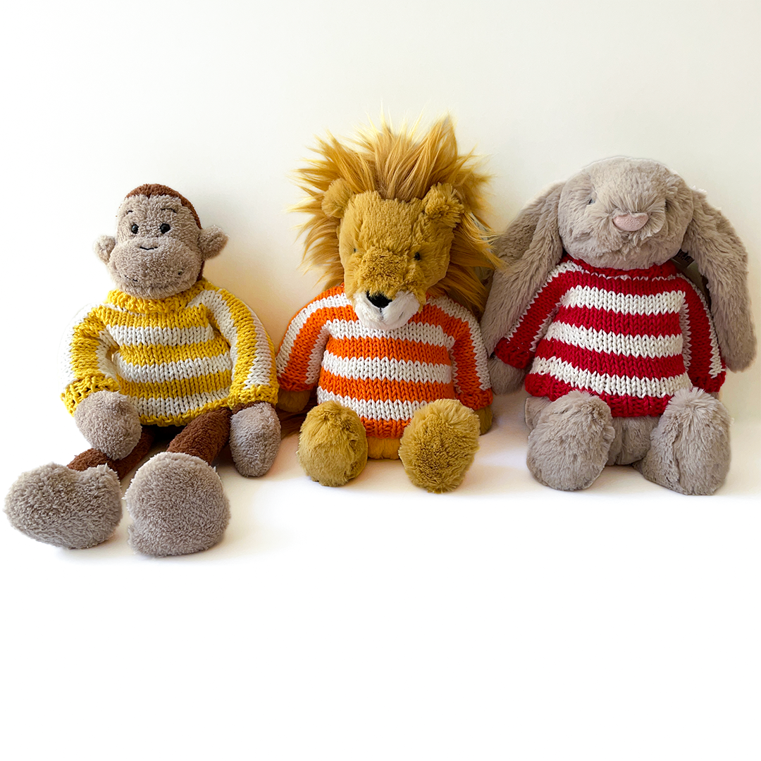 Os peluches são os melhores amigos das crianças ,estando presentes em momentos felizes de brincadeira e também em momentos especiais como o deitar, fazendo deles os melhores e mais seguros companheiros , não só em casa mas também quando vão para fora um WE ou quando vão viajar. Como tal , pensamos que cada peluche é único para a criança, e a criança deve cuidar do seu peluche e humaniza-lo o mais possível. A maioria das crianças dão nome aos seus pequenos bonecos e pensamos que vesti-los com uma camisola feita á mão é um passo adicional para fortificar os sentimentos de cuidado que cresce entre eles . Feito á mão em Portugal este tricot transforma um simples fio 100% algodão numa peça única e original. A camisola tem um tamanho único adaptado aos peluches da Jellycat ( +/- 30 cm ) .Veste todos os peluches exceto o polvo e o urso medio. Dependendo da disponibilidade do stock , as camisolas são feitas em cerca de 7 dias uteis para serem enviados.