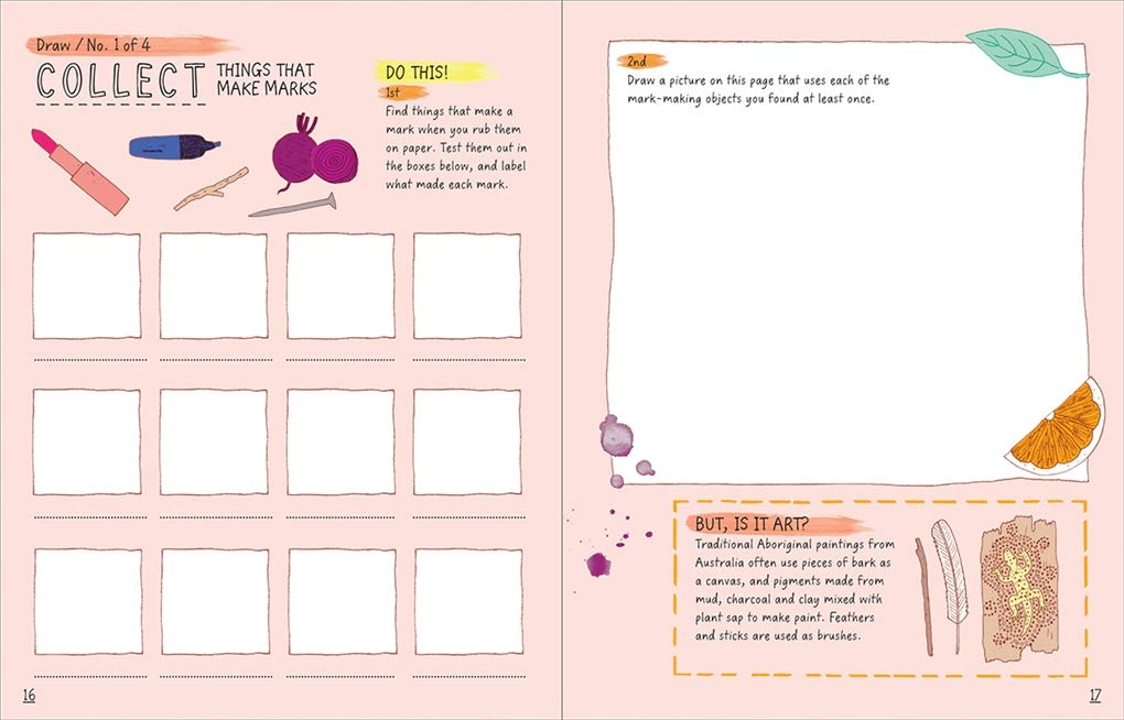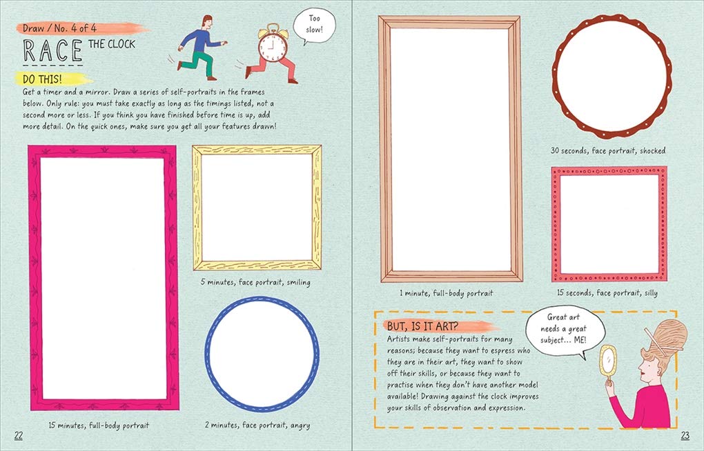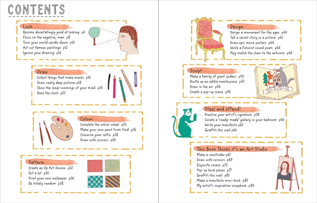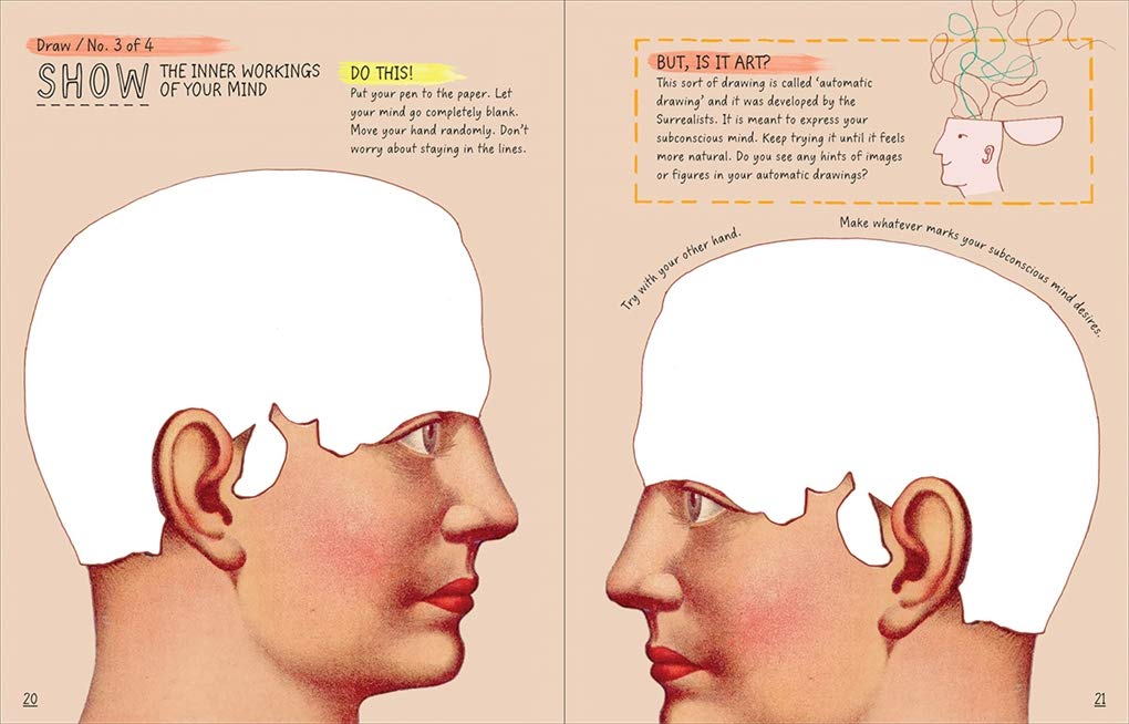 Cheio de atividades criativas e lúdicas, This Book Thinks You’re an Artist , pede aos artistas iniciantes que imaginem o seu próprio ego artístico antes de trabalharem sete tópicos chaves: observação, desenho, padrão de cores, design, escultura é crucial , como criar ideias ( estar inspirado! ) Cada página oferece um projeto diferente - tudo o que precisa para fazer a sua própria obra de arte inspirada em artistas famosos ou em movimentos famosos de forma alegre e lúdica. As atividades incluem fazer um circo de Bruegel, fazer um jogo surrealista, vender um rabisco por um milhão de dólar, pintar o seu rosto como um futurista. Uma secção para trabalhos manuais á base de papel. No final do livro inclui um kit para construir um visor e fazer um mini manifesto
