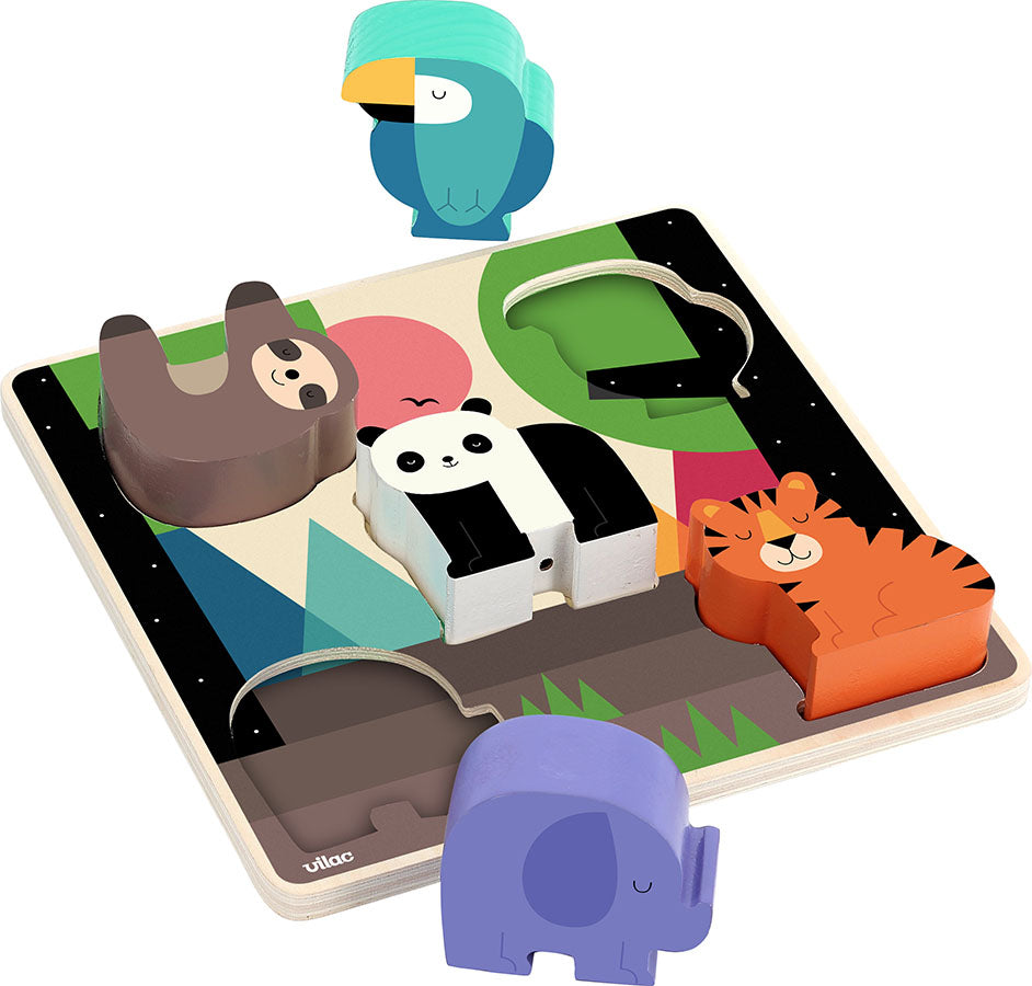 Discover the animals of the jungle with our wooden sound puzzle, poetically illustrated by Andy Westface. With its tree-filled decor, dreamy animals and gentle sounds, your child will develop their sense of hearing as well as their analytical and observational skills.